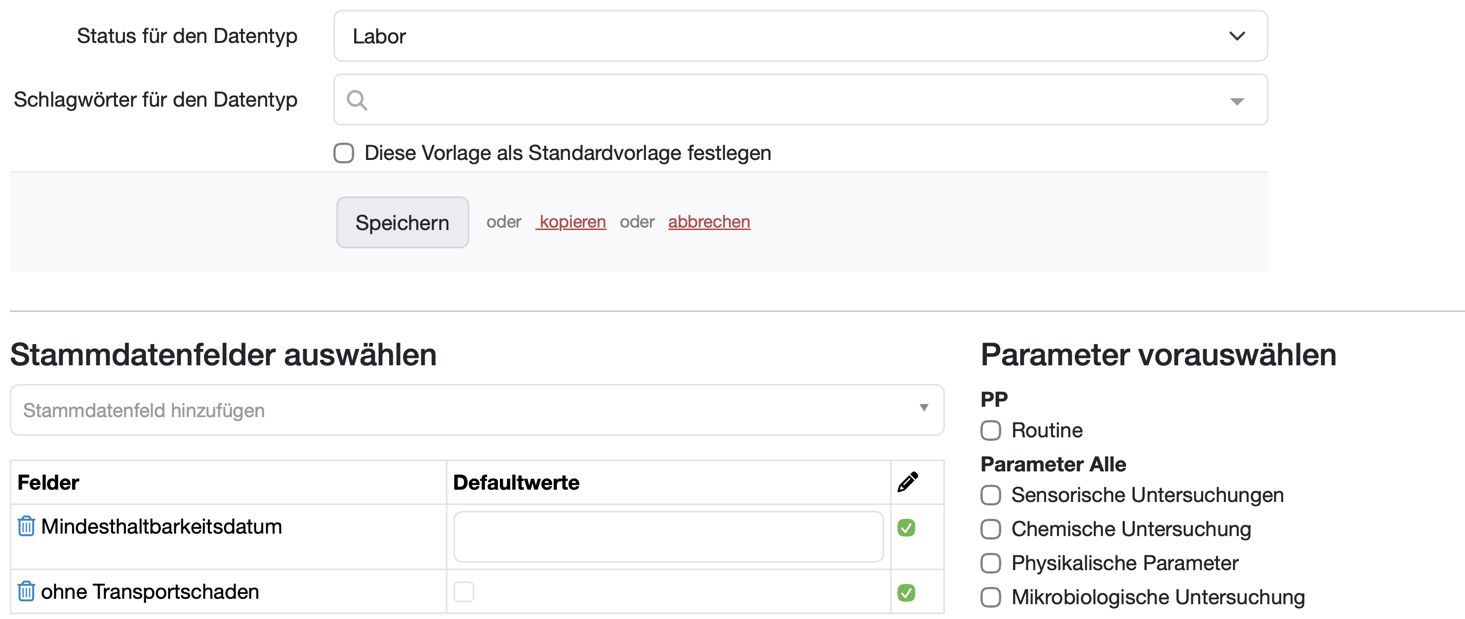 Erstellen Sie z.B. Probenvorlagen für bestimmte Probentypen (z. B. Lebensmittel, Wasser) und wählen Sie die jeweils relevanten Stammdatenfelder und Parameter standardmäßig in den Probenvorlagen aus. So erscheint bei einer Lebensmittelprobe automatisch z.B. das Mindesthaltbarkeitsdatum als Pflichtfeld, bei einer Wasserprobe nicht.