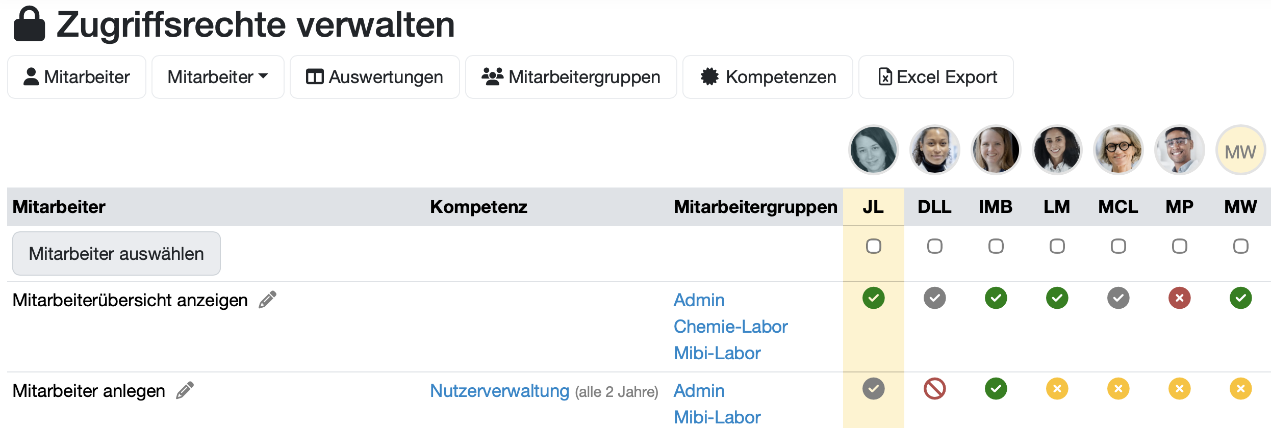 Mitarbeiter, Gruppen und Rollen sinnvoll strukturieren, Zugriffsrechte vergeben (wer darf was sehen, bearbeiten, löschen) und Kompetenzen mit Zugriffsrechten koppeln um ein ISO 17025-konformes Rechtemanagement aufzubauen.