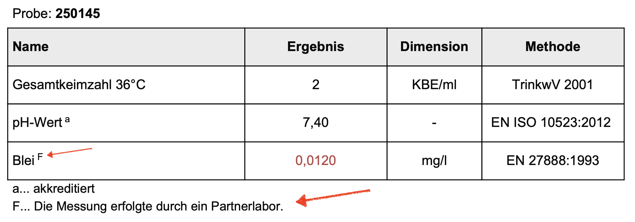 Auf Ihrem Prüfbericht wird der Parameter entsprechend gekennzeichnet. Der Legendentext F ... Die Messung erfolgte durch ein Partnerlabor. wird automatisch eingeblendet, sobald ein Parameter das Kriterium Fremdvergabe erfüllt.