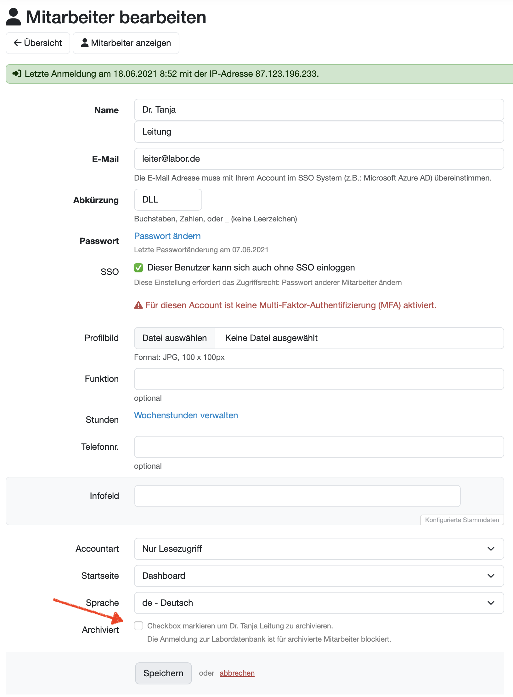 Archivierte Mitarbeiter können sich nicht mehr in der Labordatenbank anmelden.
