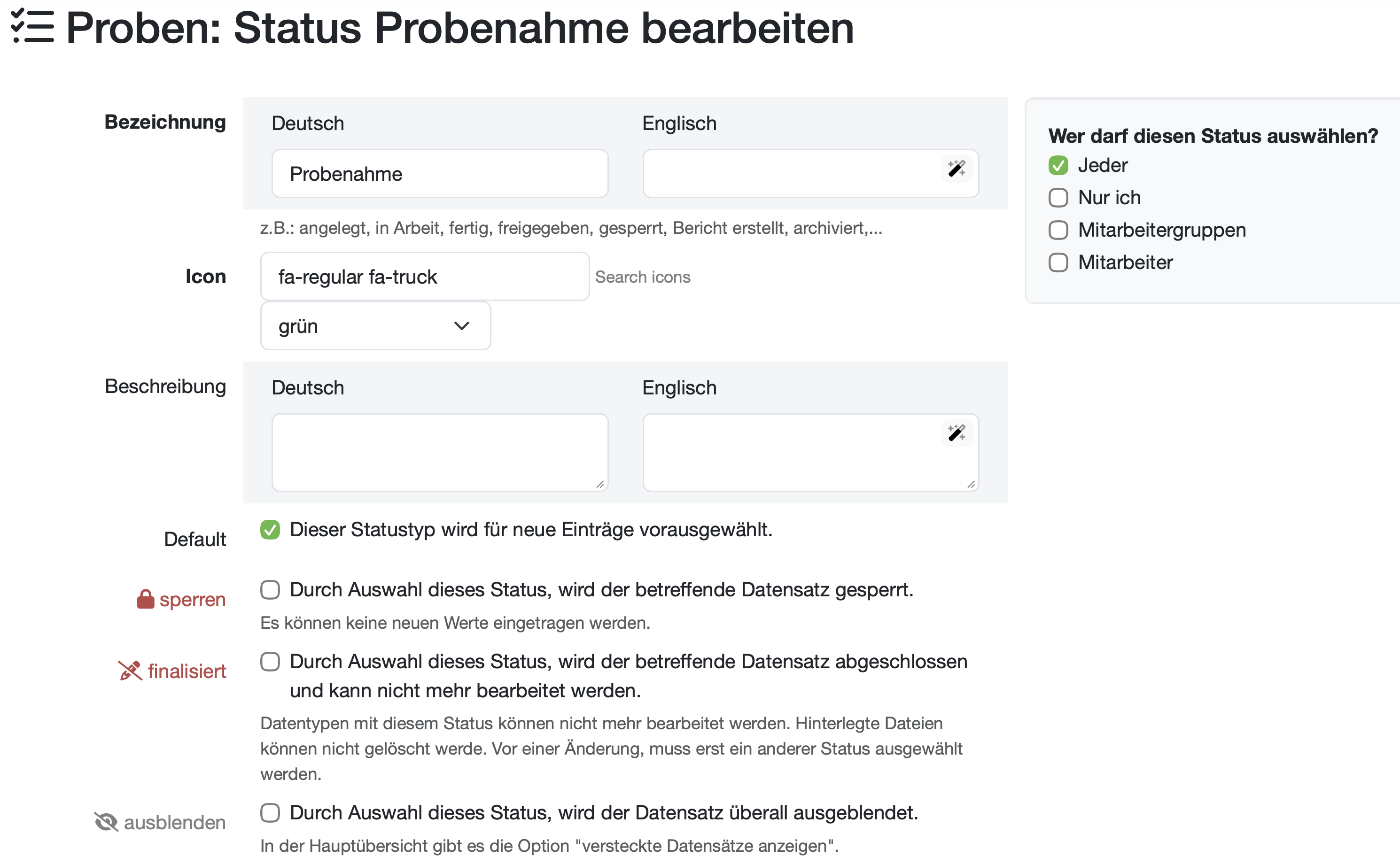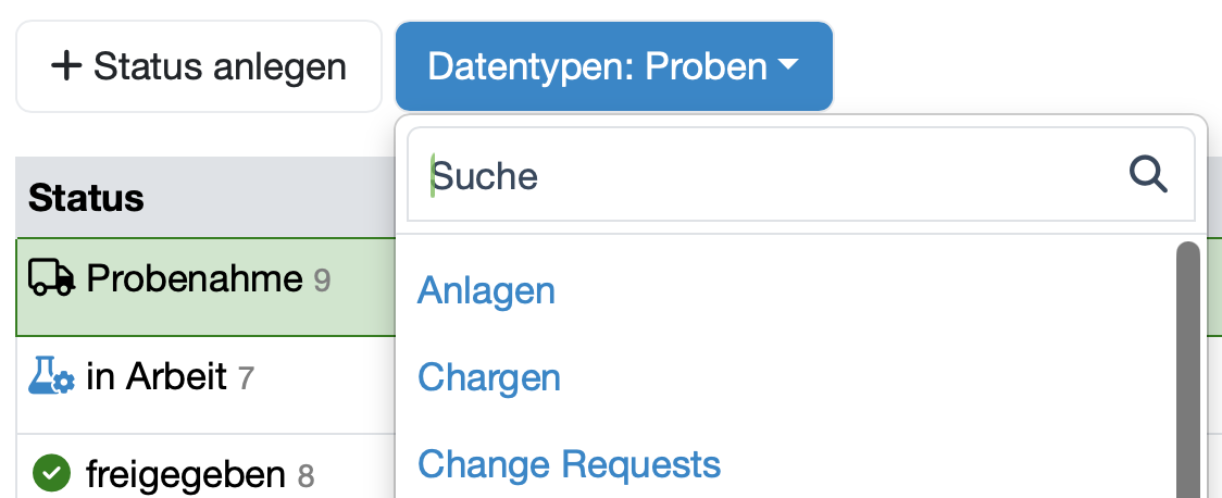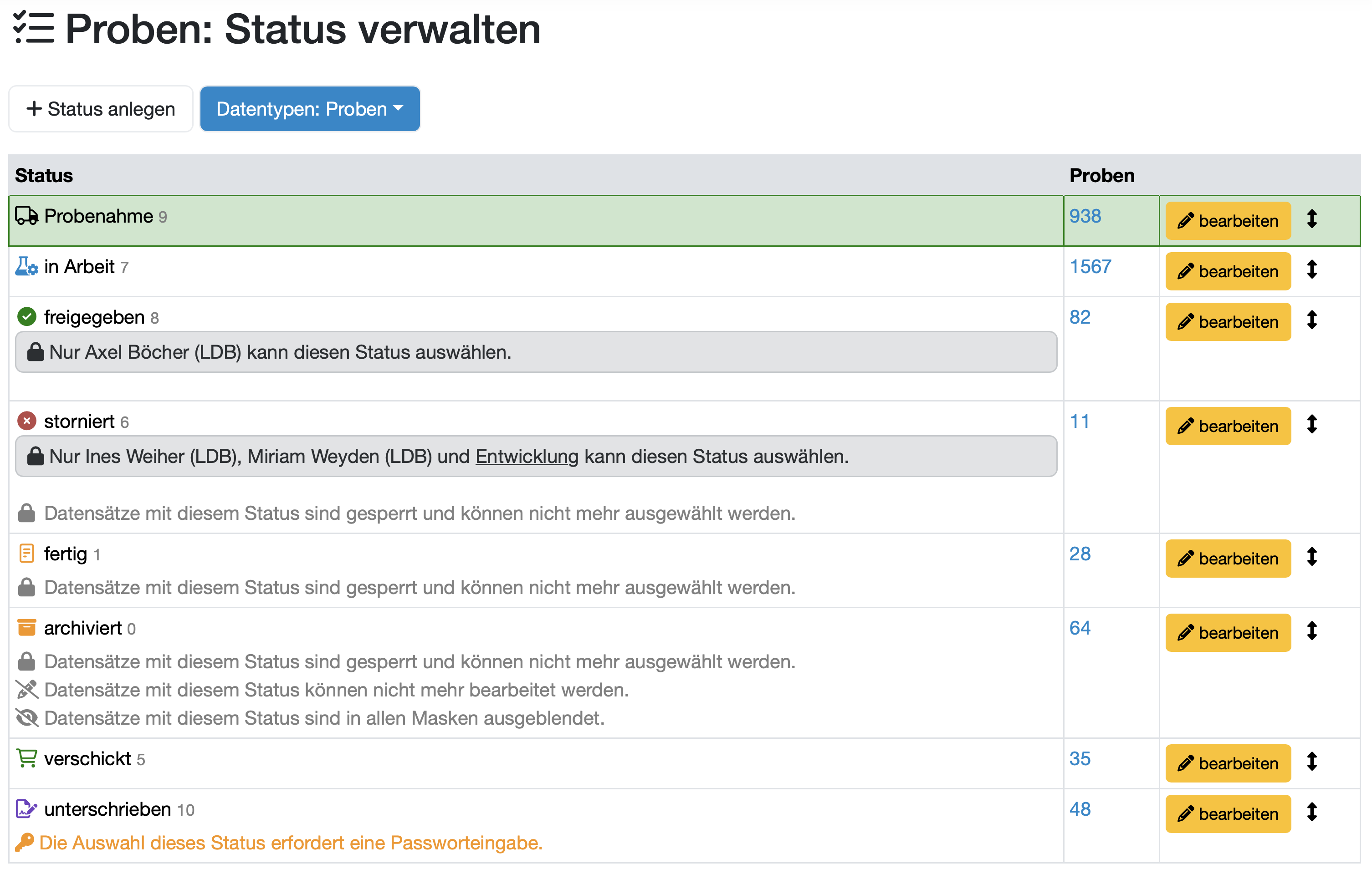 Die Statusverwaltung gilt jeweils für einen bestimmten Datentyp der Labordatenbank (z. B. Proben, Aufträge, Kunden, Materialien. Prozesse ...).