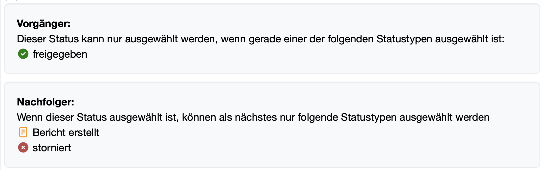 - Vorgänger: Zeigt an, welche Status vor dem aktuellen Status gewählt worden sein müssen.
