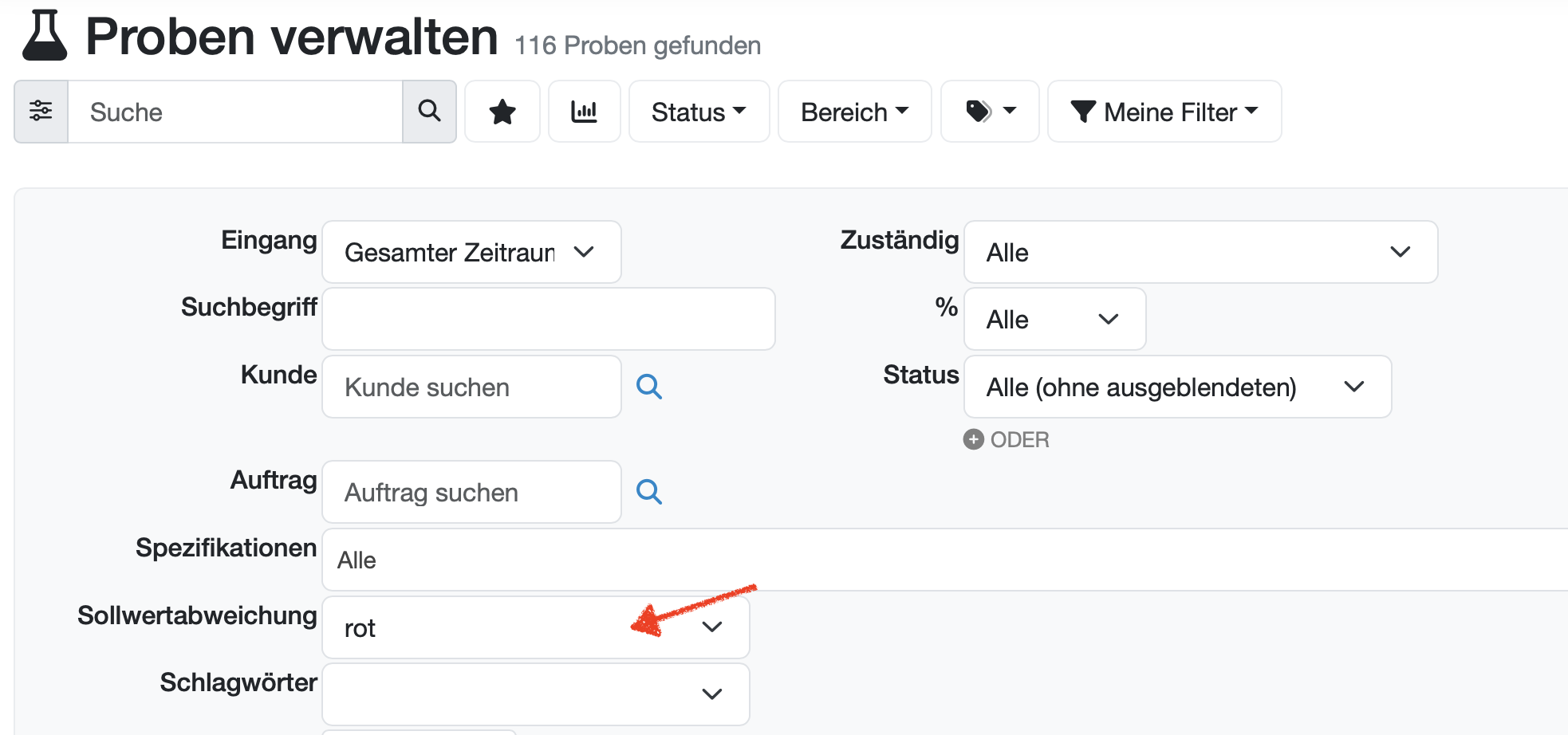 Mit dem Filter Sollwertabweichung können Sie gezielt nach Proben suchen, die von den definierten Sollwerten abweichen.