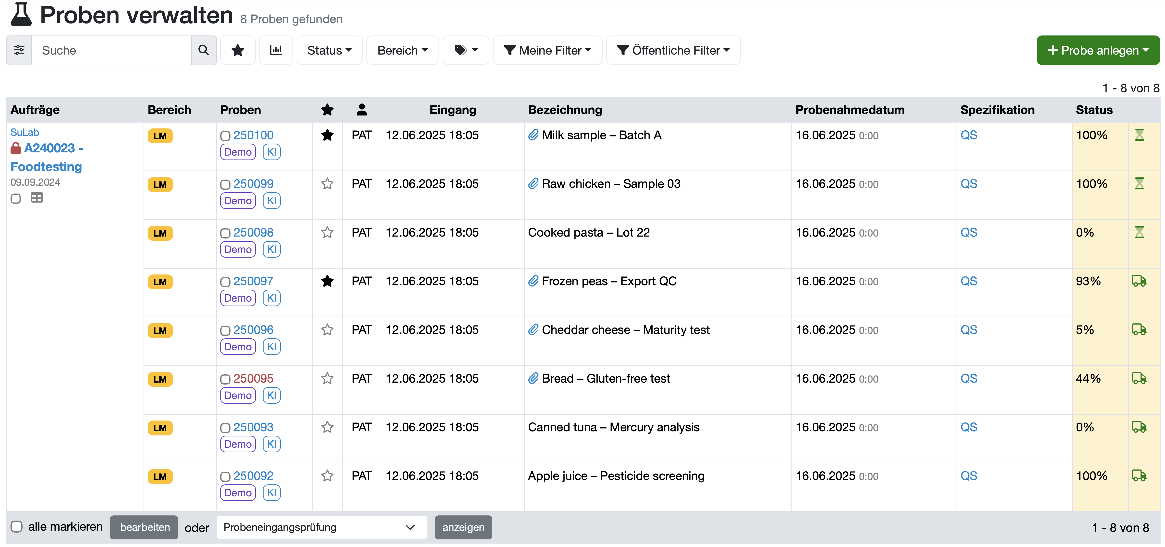 | Status | Zeigt den aktuellen Bearbeitungsfortschritt der Probe in Prozent sowie ein farbiges Symbol zur schnellen Statuserkennung an. |