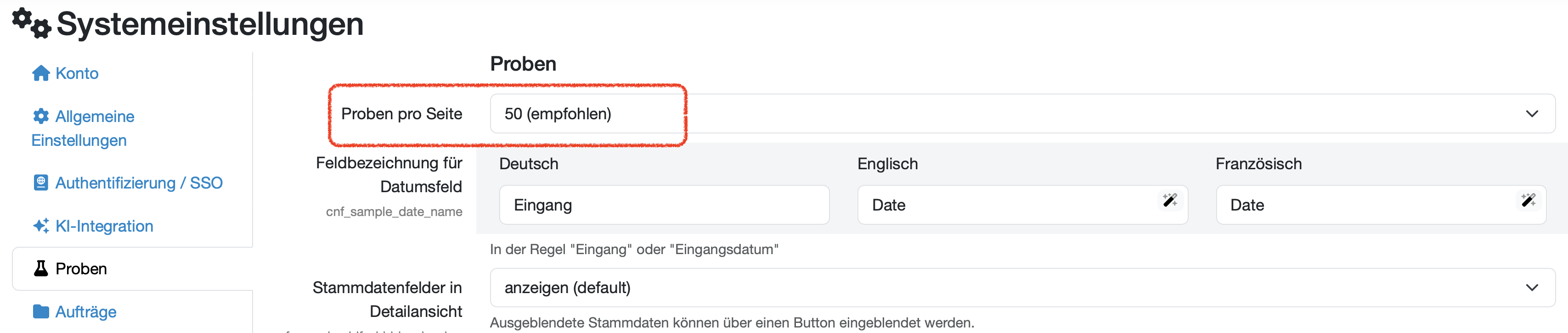 | Proben | Enthält die blau hinterlegte Probennummer, über die Sie zur Detailansicht der Probe gelangen. Die Proben werden pro Auftrag gruppiert angezeigt. Für die Sortierung der Proben in der Probenliste gibt es verschiedene Optionen. Standardmäßig werden 50 Proben pro Seite angezeigt. |