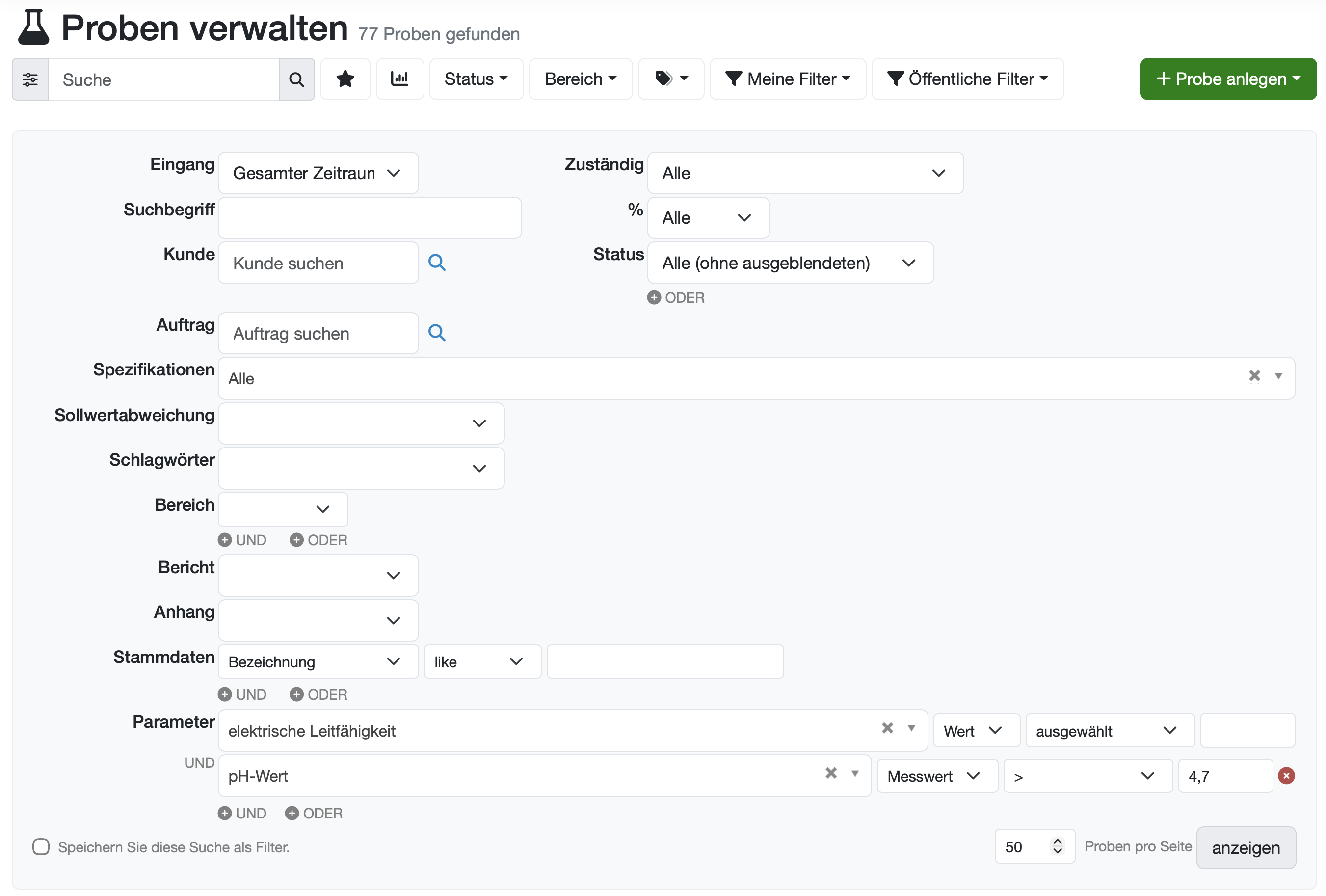 So lassen sich beispielsweise alle Proben finden, bei denen der Parameter Leitfähigkeit ausgewählt ist und der pH-Wert > 4,7 ist.