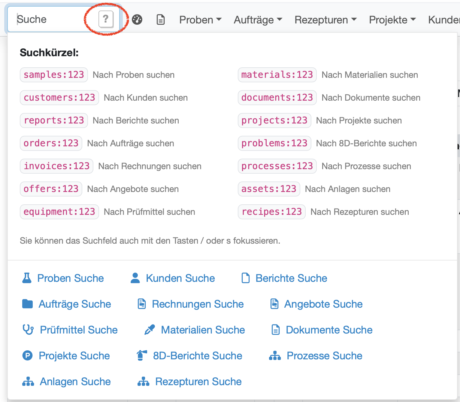 Sie können einfach den ersten Buchstaben des Suchkürzels verwenden, z.B. s:123 für Proben oder die speziellen Suchkürzeln wie samples:123 oder customers:123 verwenden.