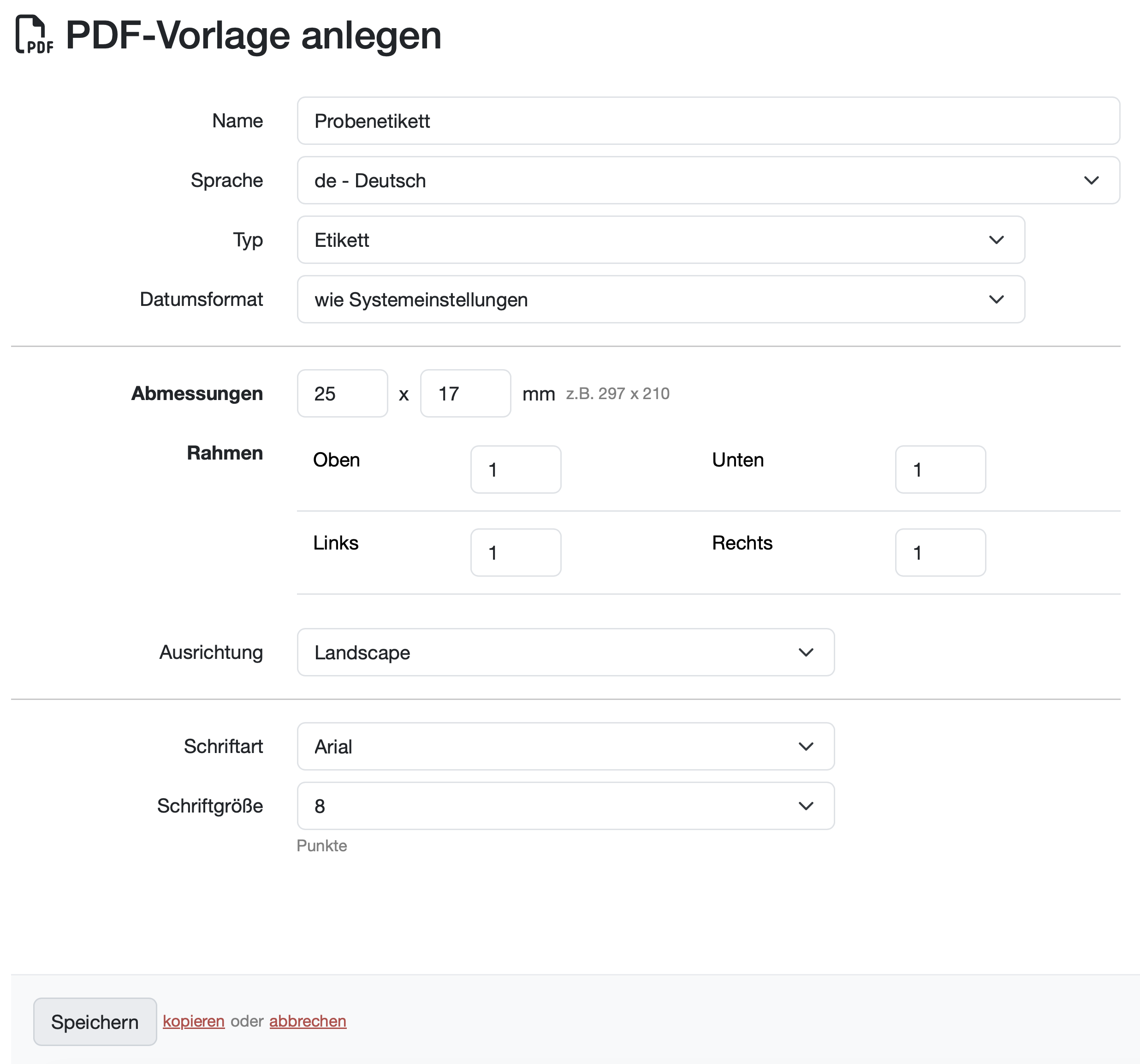Name: Geben Sie der Vorlage einen eindeutigen Namen (z.B. "Probenetikett")