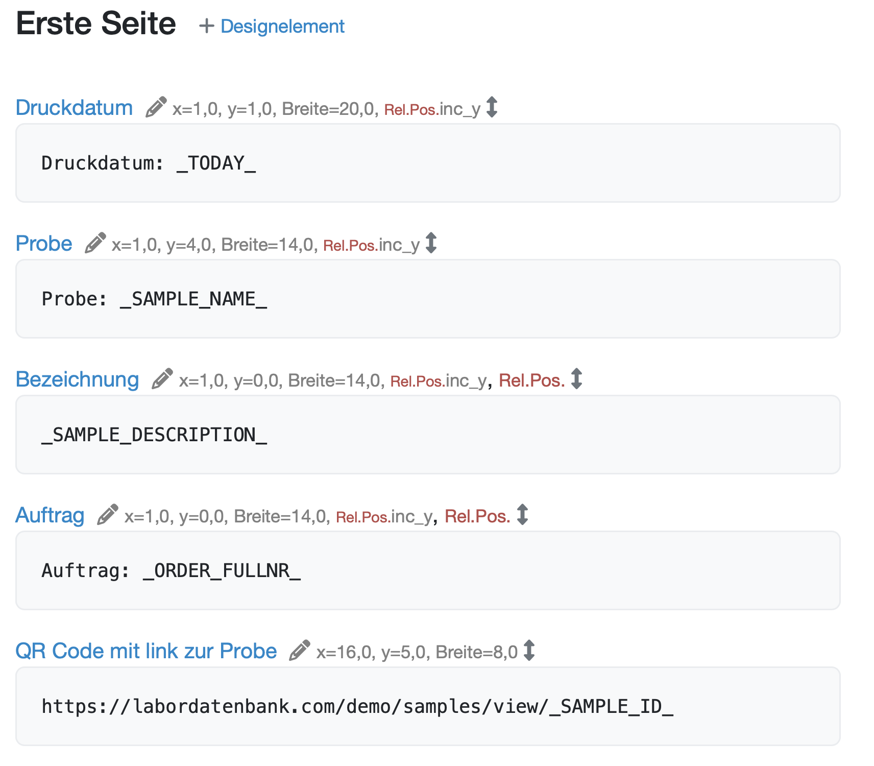 QR Code: Für den QR-Code benötigen Sie ein Designelement mit dem Typ QR-Code. Damit der QR-Code den Link zur Probe in Ihrer Labordatenbank darstellt, verwenden Sie die Variable SAMPLE_ID. Kopieren Sie die vollständige URL der Probenansicht aus der Browser-Adressleiste und ersetzen Sie die spezifische ID (z.B. 12345) am Ende der URL durch SAMPLE_ID.
