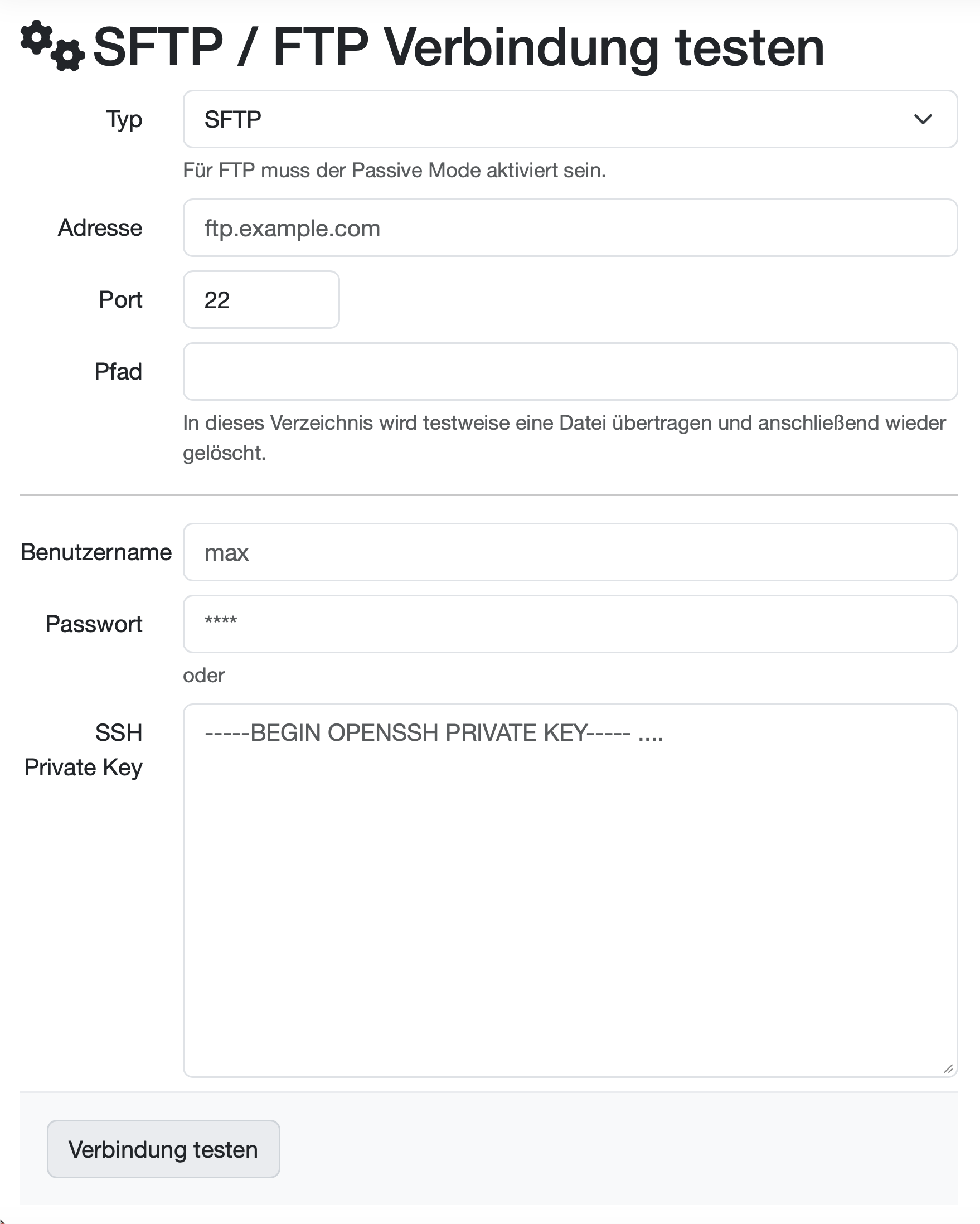 Typ: Ein Dropdown-Menü zur Auswahl zwischen SFTP und FTP. Standardmäßig ist SFTP ausgewählt. Für die Verwendung von FTP Servern muss der Passive Mode aktiviert sein.