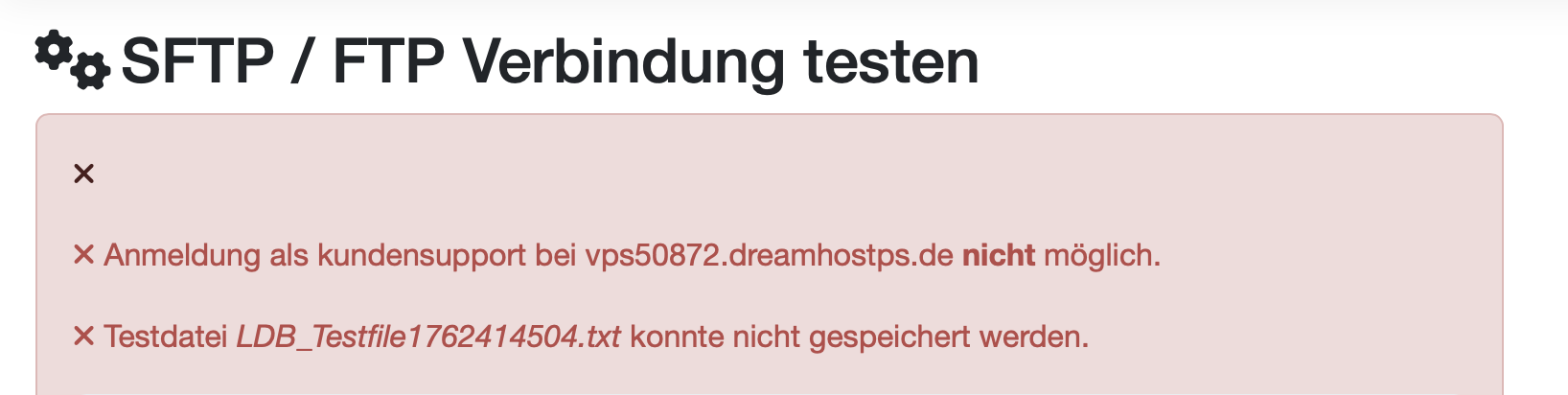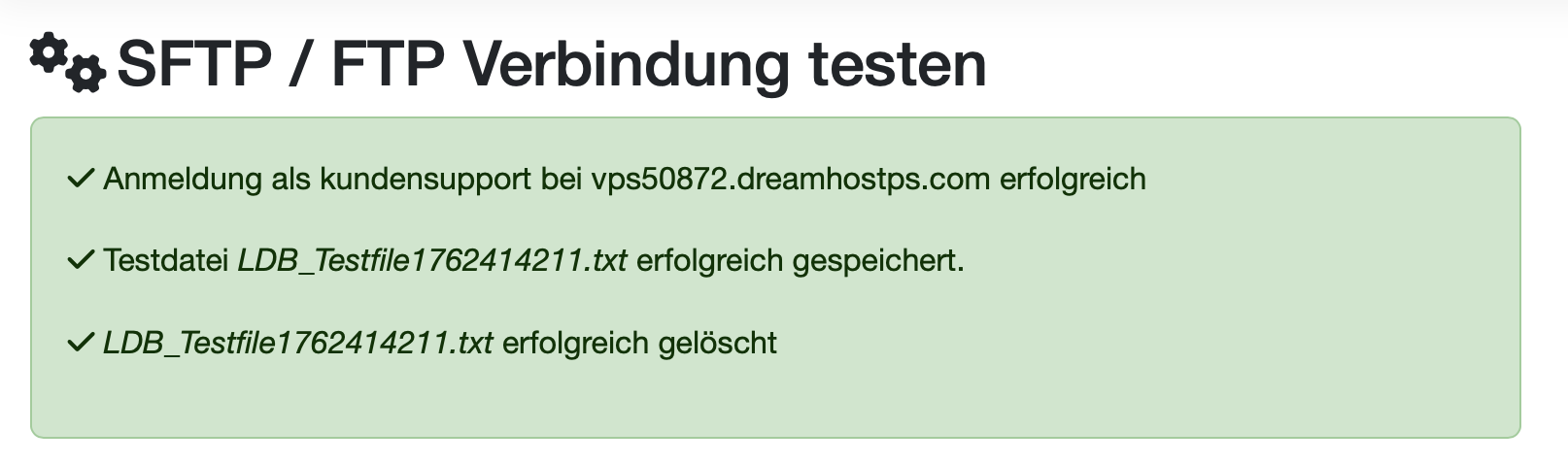 Pfad: Das Eingabefeld für das Zielverzeichnis auf dem Server. Dieses Feld definiert, in welchem Verzeichnis die Dateien für den Import gesucht werden sollen. Um die Funktionalität zu überprüfen wird in dieses Verzeichnis testweise eine Datei übertragen und anschließend wieder gelöscht.