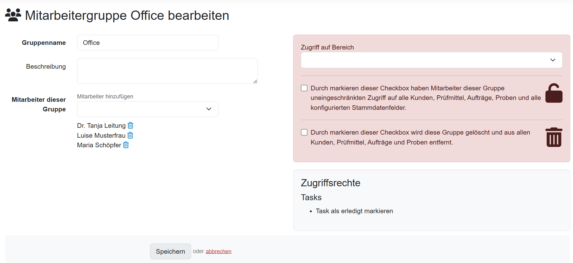 Checkbox: Durch Markieren dieser Checkbox haben Mitarbeiter dieser Gruppe uneingeschränkten Zugriff auf alle Kunden, Aufträge, Proben, Prüfmittel, Parameter, Dokumente und alle konfigurierten Stammdatenfelder.