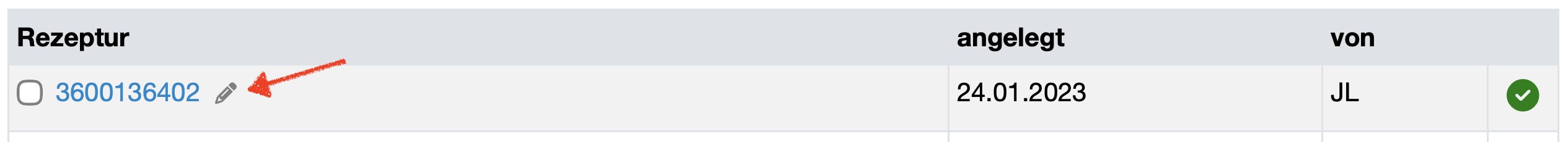 Klicken Sie in der Rezepturübersicht auf das Stift-Symbol neben der Rezeptur-Bezeichung, um die Rezeptur zu bearbeiten.