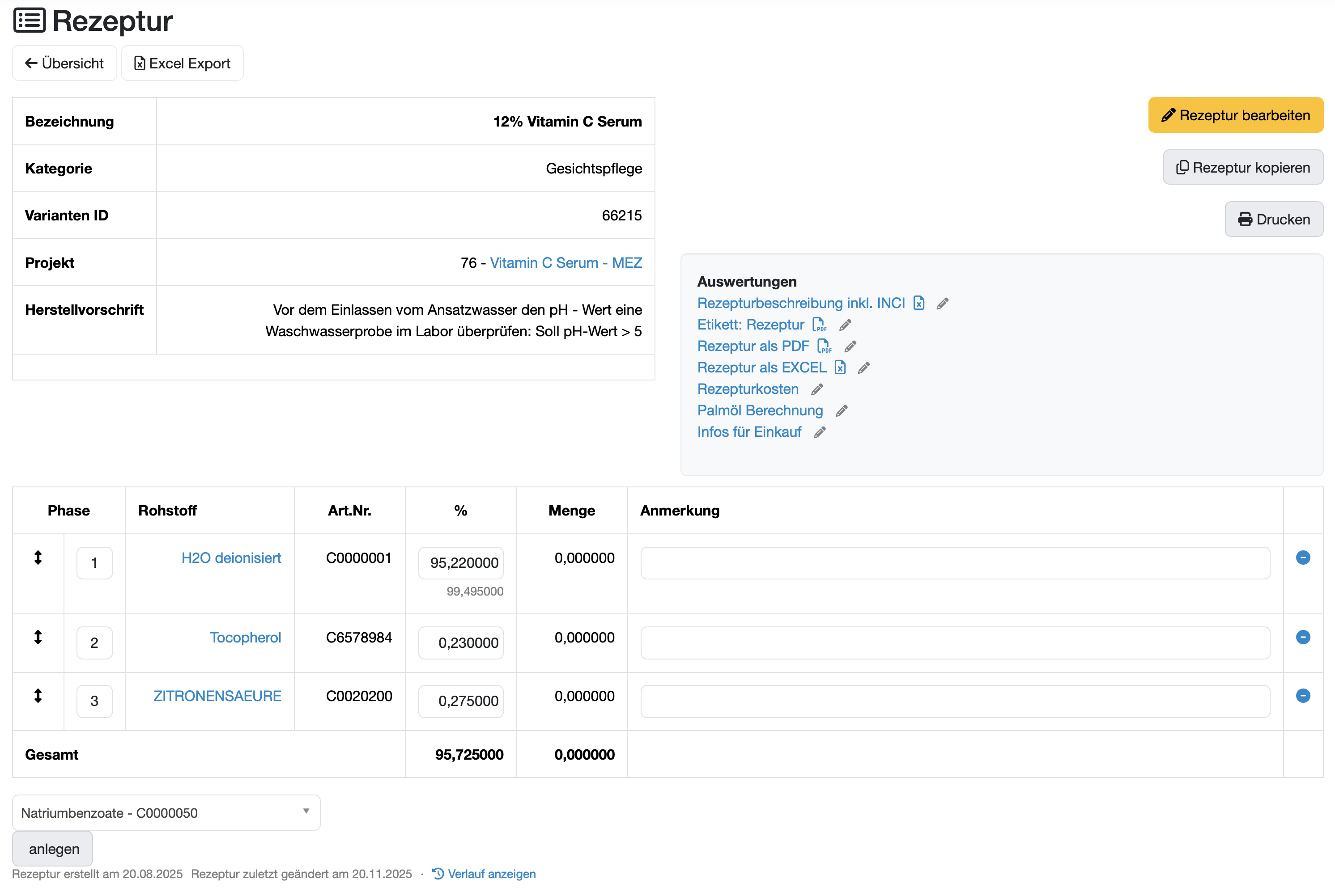In diesem Beispiel erstellt Ihnen die Auswertung Rezepturbeschreibung inkl. INCI eine vollständige Rezepturbeschreibung mit allen Rohstoffen und INCIs zur Produktkennzeichnung und regulatorische Dokumentation. Etikett: Rezeptur generiert ein kompaktes Produktetikett mit den wichtigsten Rezepturinformationen, QR-Code... Die beiden Export-Optionen Rezeptur als PDF und Rezeptur als Excel stellen die komplette Rezeptur entweder als PDF zur Archivierung und Produktionsdokumentation oder als Excel-Datei für flexible Weiterverarbeitung bereit. Rezepturkosten zeigt eine detaillierte Kostenaufstellung aller Rohstoffe mit Gesamtkostenübersicht. Die Palmöl Berechnung berechnet den Anteil von Palmöl für Nachhaltigkeitszertifizierungen. Information für Einkauf liefert einen einkaufsspezifischen Report mit Rohstoffmengen, Artikelnummern und allen relevanten Informationen für die Einkaufsabteilung.