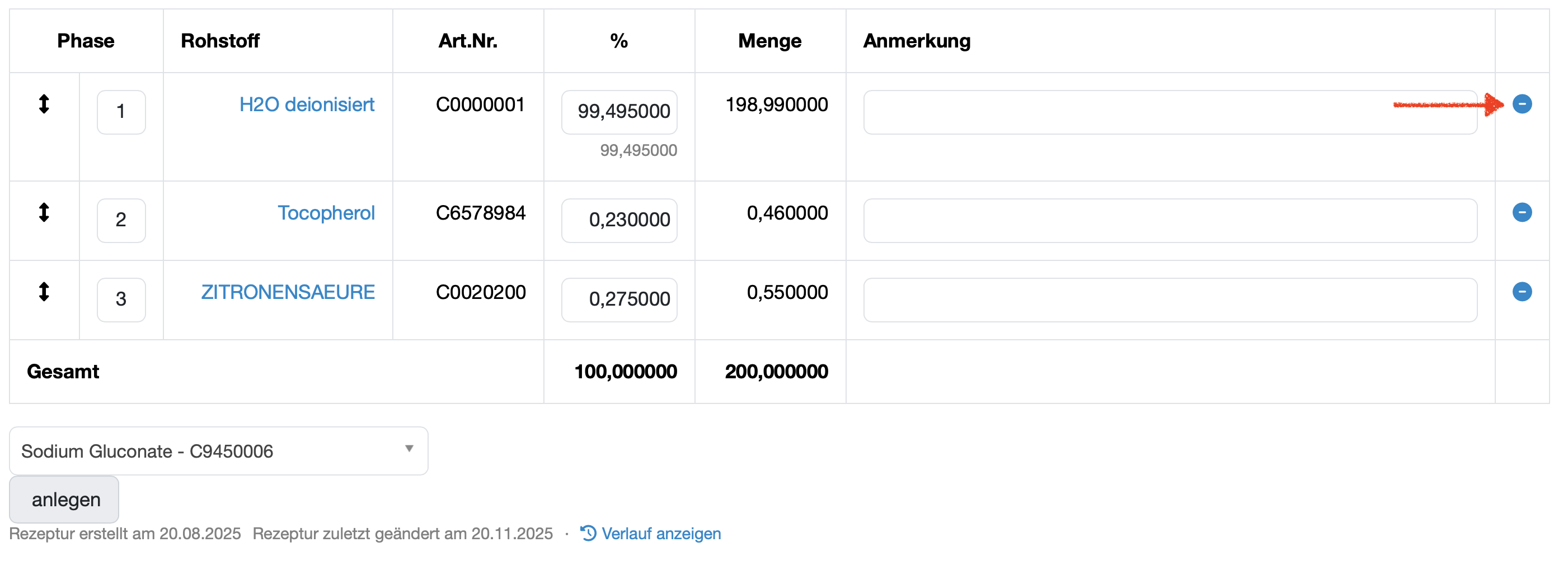 Blaue Kreise: einzelne Bestandteile aus der Rezeptur entfernen