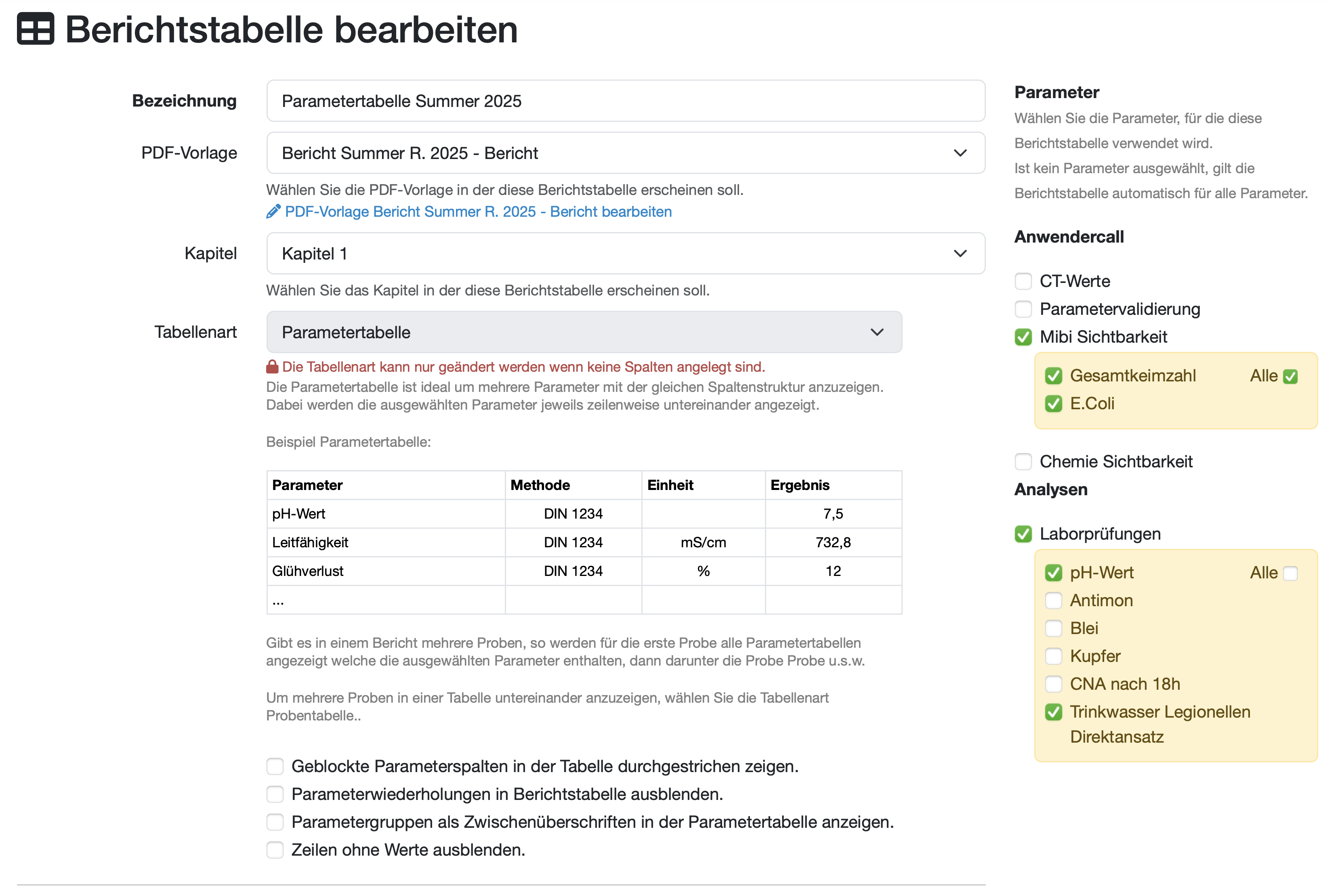 - relevante Parameter auswählen: Wählen Sie per Checkbox die Parameter, für die diese Berichtstabelle verwendet wird. Ist kein Parameter ausgewählt, gilt die Berichtstabelle automatisch für alle Parameter.
