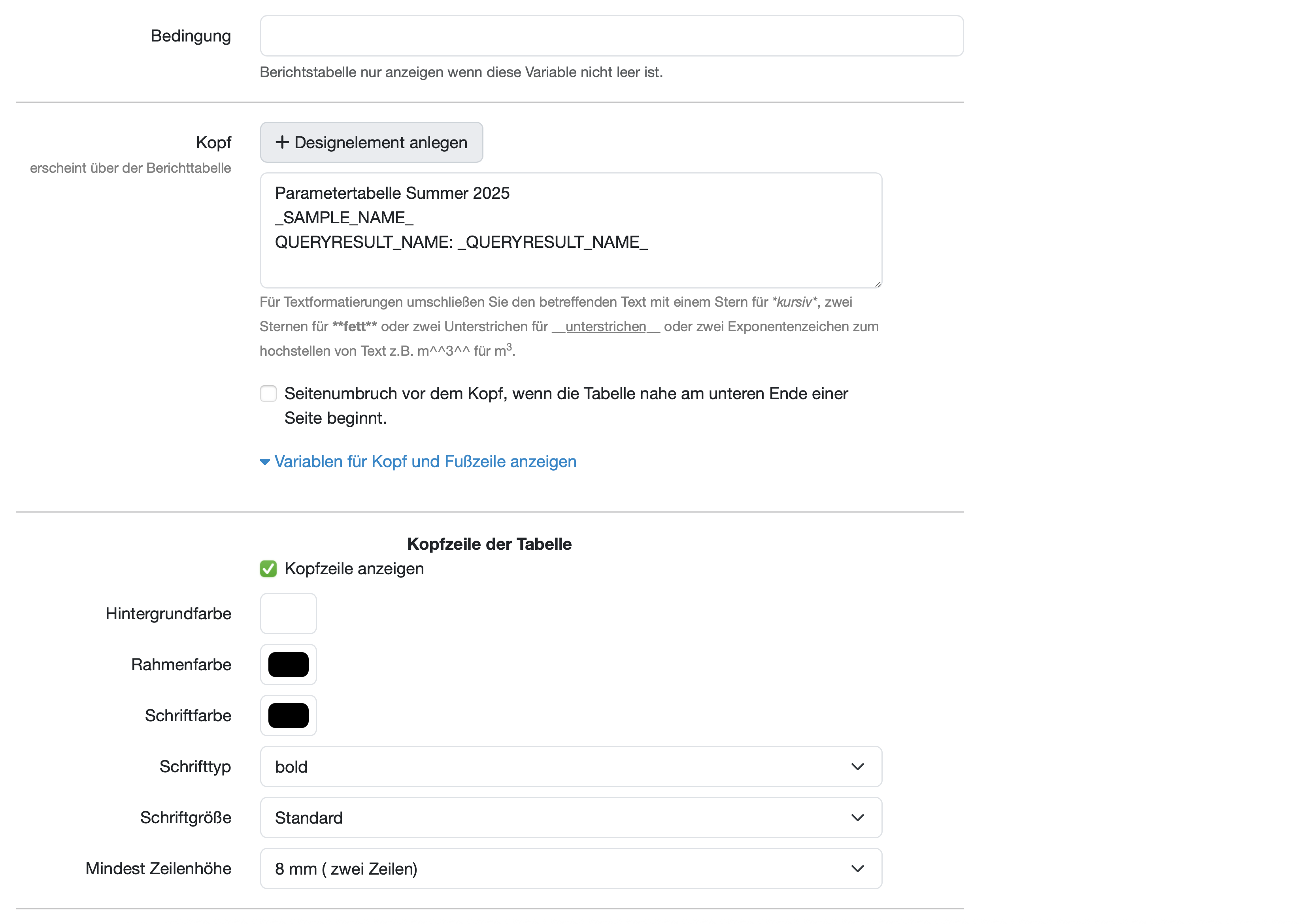 - Tabellenüberschrift eingeben (Textfeld): Fixe und dynamische Inhalte sind im Textfeld für den Kopf definierbar. Dynamische Inhalt können mittels Variablen angegeben werden und passen sich automatisch an. Die Probenummer wird z.B. mittels