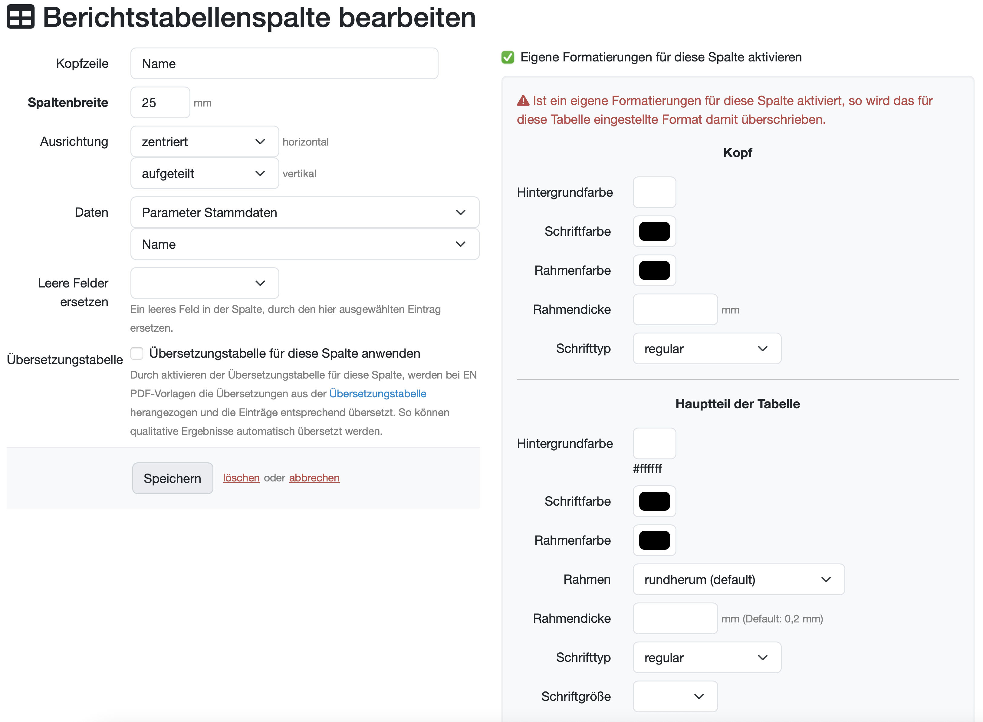 Diese Seite ermöglicht die detaillierte Konfiguration einer einzelnen Spalte in einer Berichtstabelle. Hier können alle Formatierungsoptionen, Datenquellen und Layout-Einstellungen für eine spezifische Spalte angepasst werden.