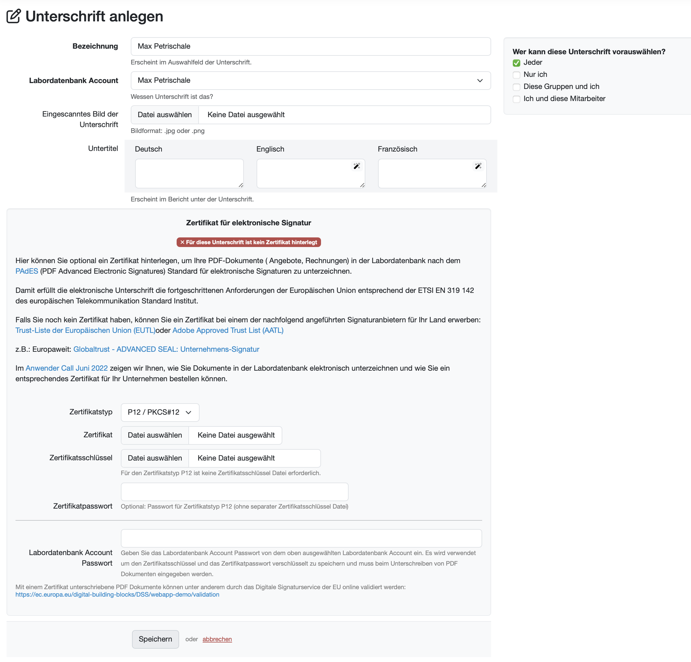 - Labordatenbank Account (Dropdown-Auswahl): Wählen Sie den Account aus, dessen Unterschrift Sie konfigurieren.