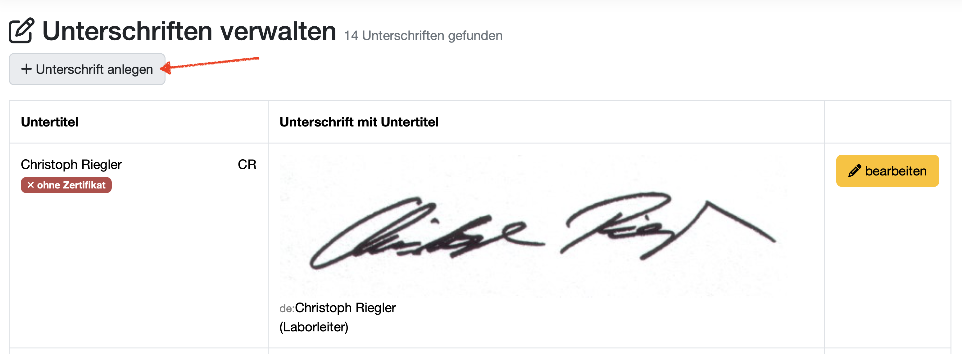 - Unter der Menü-Überschrift findet sich der Button zum Anlegen einer neuen Unterschrift.