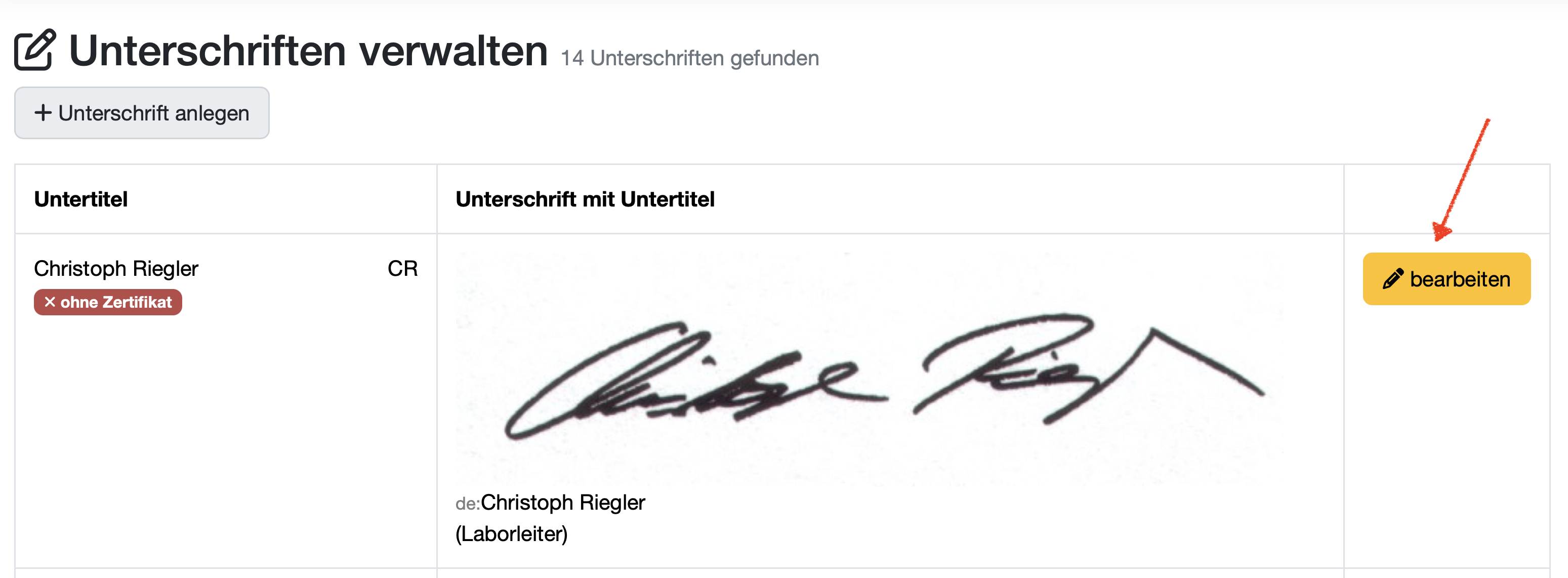 - Klicken Sie im rechten Abschnitt der Seite bei der relevanten Unterschrift auf den orange hinterlegten Button "bearbeiten".
