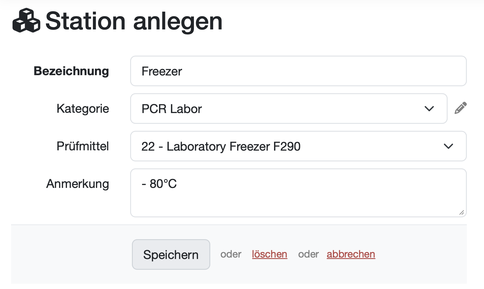 Bezeichnung (Pflichtfeld): Geben Sie hier die Bezeichnung der Station ein. Die Bezeichnung erscheint in der Stationsübersicht und beim QR-Code-Scanning.