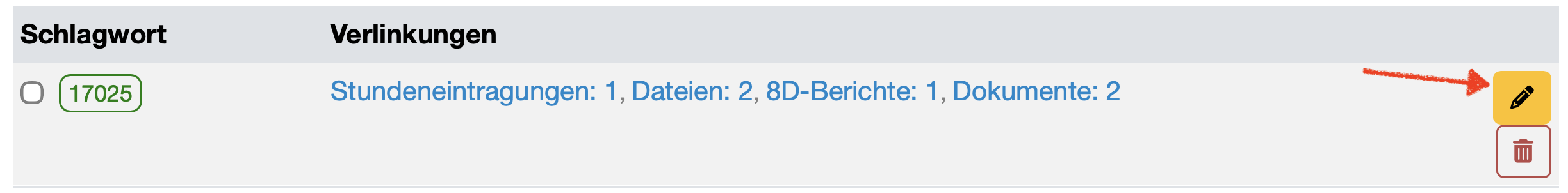 - Klicken Sie auf den orangen Button mit dem Stiftsymbol am rechten Rand der jeweiligen Schlagwort-Zeile.