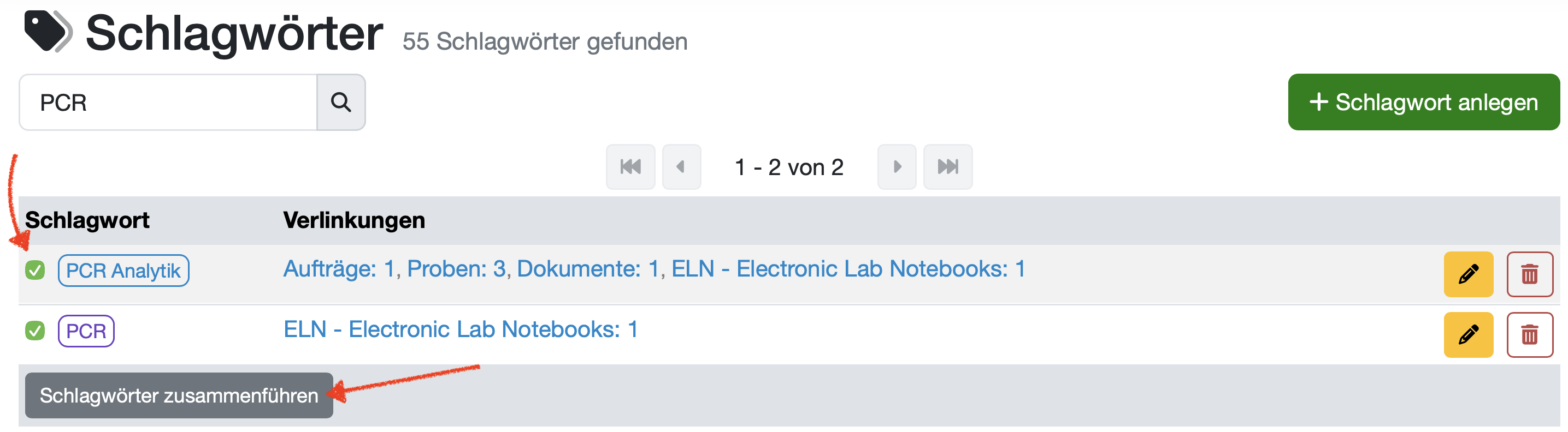 - Markieren Sie die Checkbox rechts von den Schlagwörtern die Sie zusammenführen möchten.