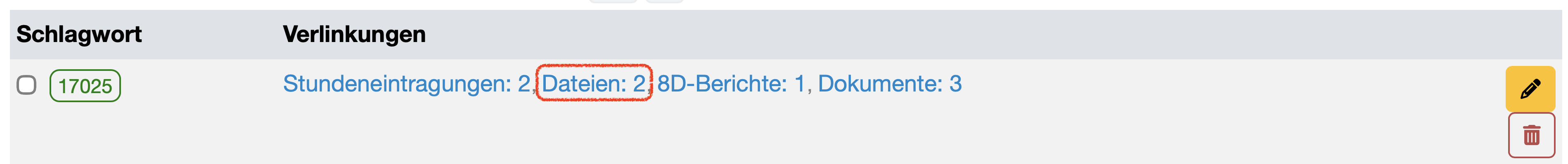 - Wenn Sie wissen möchten welche Datensätze eines bestimmten Datentyps, z.B. welche Dateien, mit einem Schlagwort verlinkt sind, klicken Sie auf den blau hinterlegten Namen des Datentyps in der Zeile des Schlagworts.