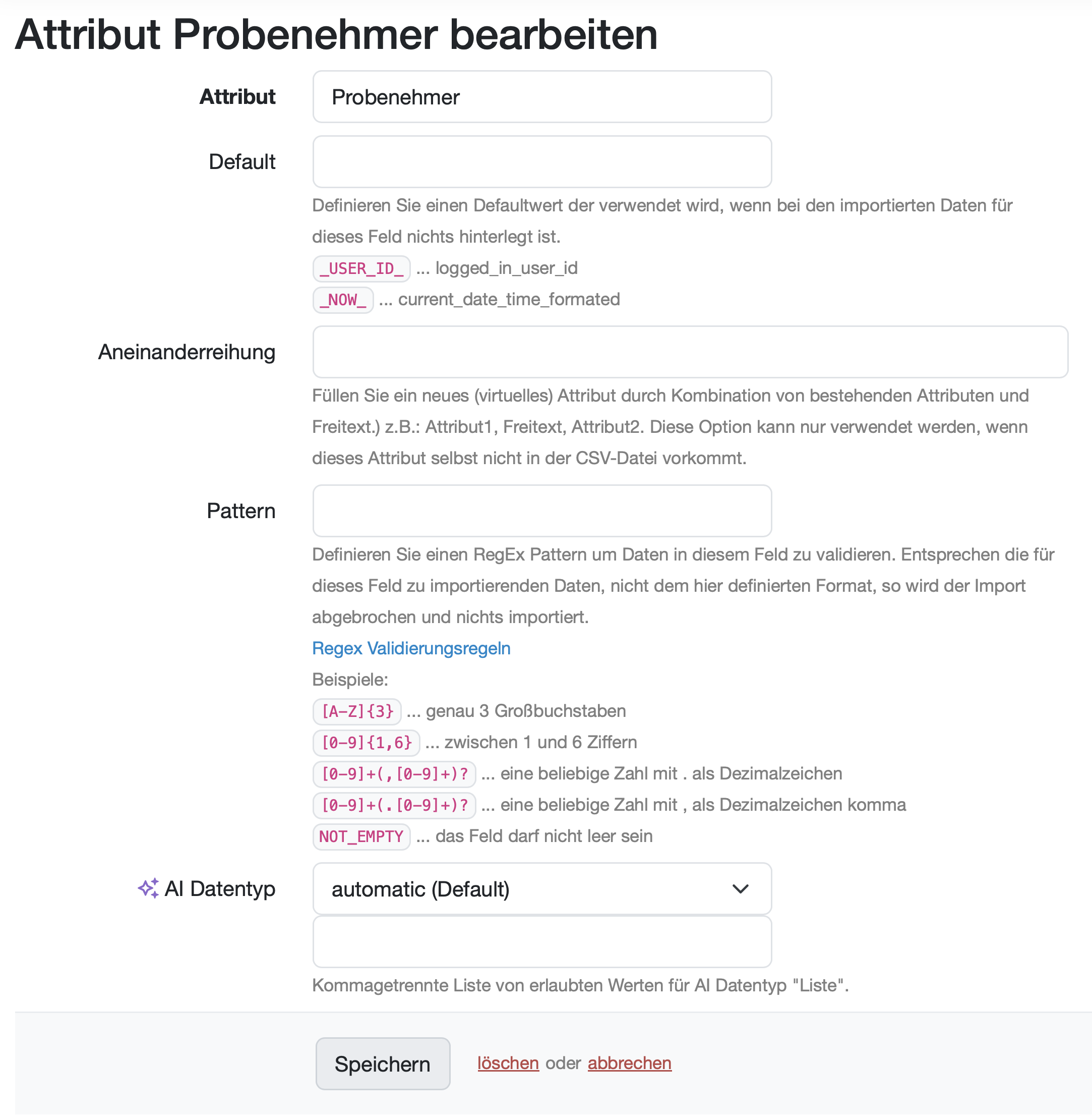 [A-Z]{3} ... genau 3 Großbuchstaben[0-9]{1,6} ... zwischen 1 und 6 Ziffern[0-9]+(\.[0-9]+)? ... beliebige Zahl mit . als Dezimalzeichen[0-9]+(,[0-9]+)? ... beliebige Zahl mit , als DezimalzeichenNOT_EMPTY ... das Feld darf nicht leer seinVerfügbare AI-Datentypen: