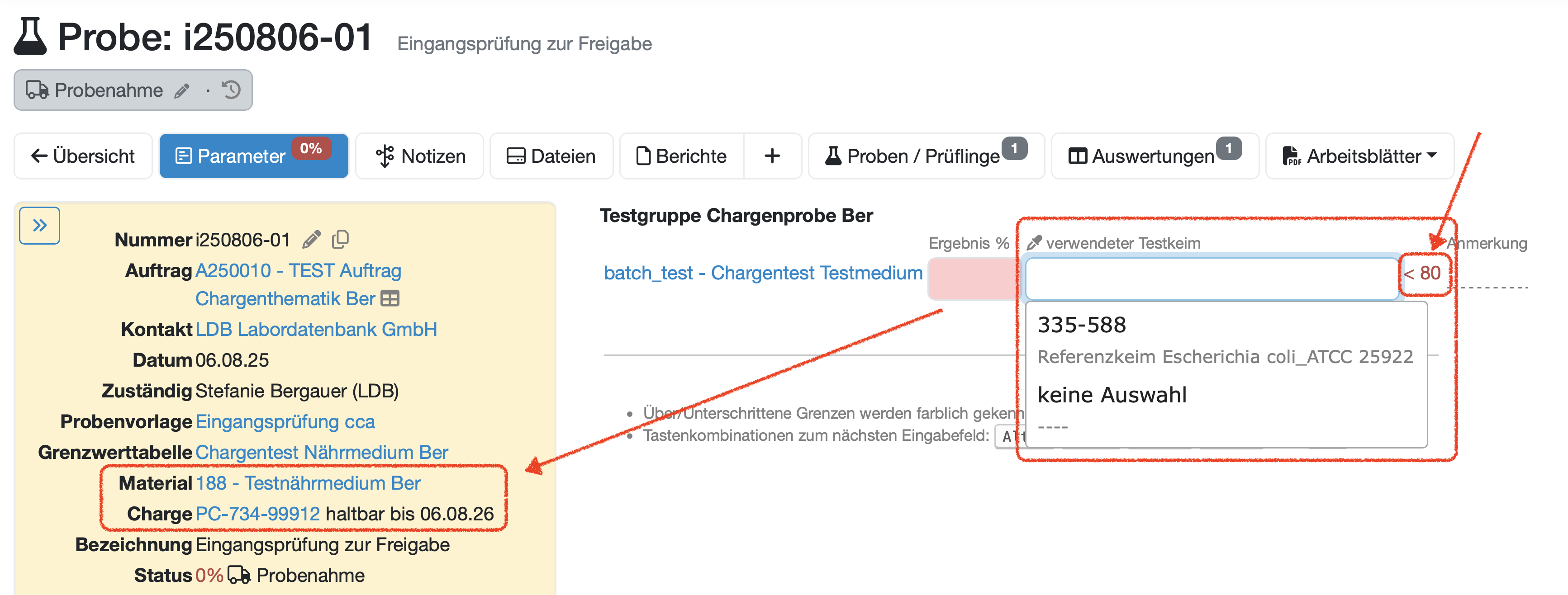 kann eine ganze Material-Kategorie hinterlegt werden, um aus dieser dann den freigegebenen Referenzkeim zu wählen.Messwerterfassung