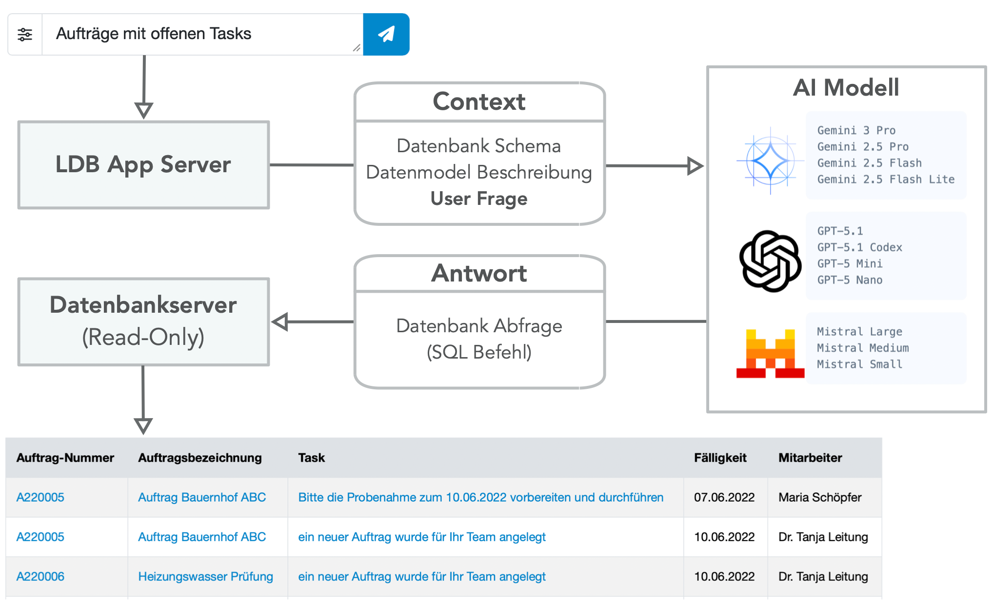 Für jede weitere Frage innerhalb einer Session wird der Query angepasst und der AI-Assistenz-Bereich nach unten hin erweitert.