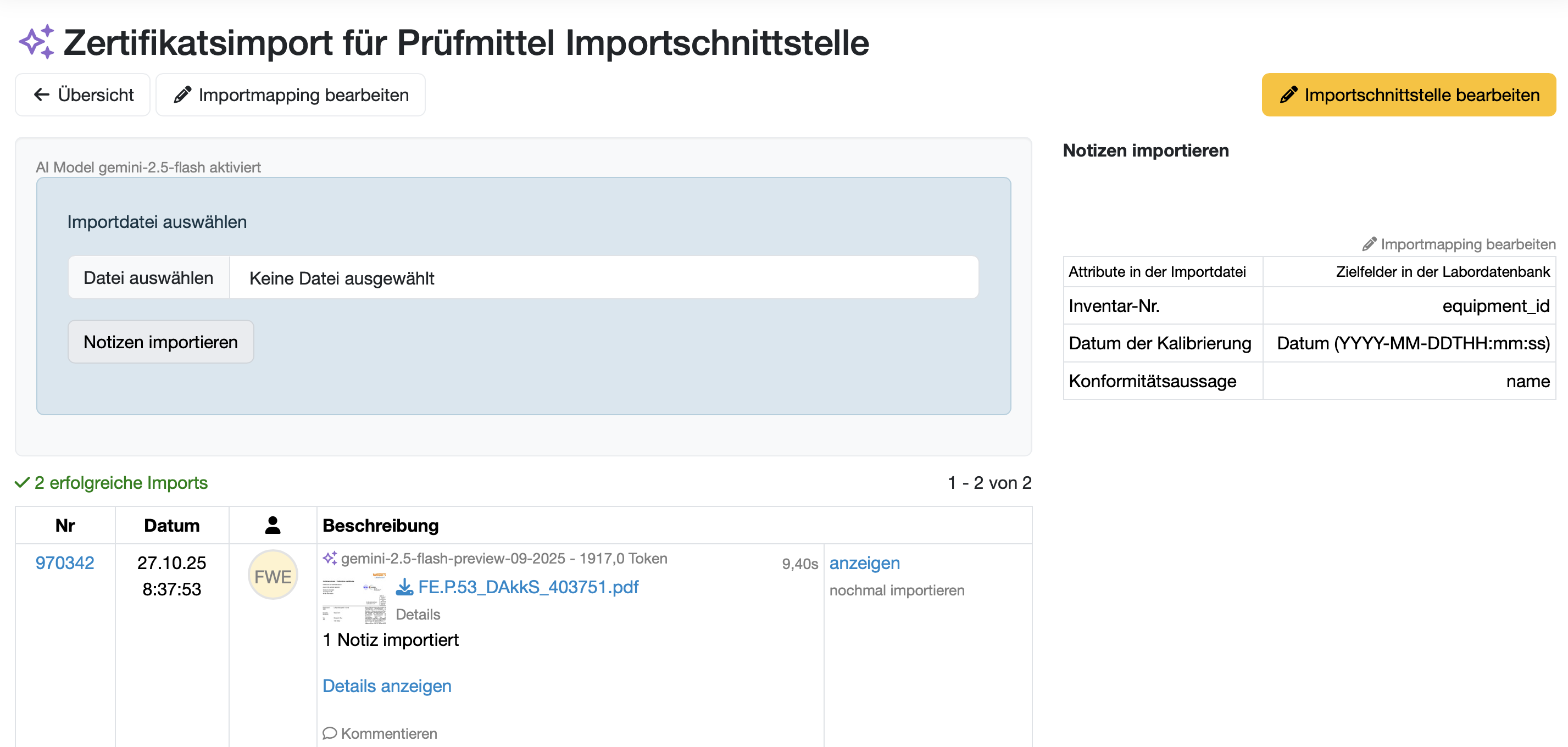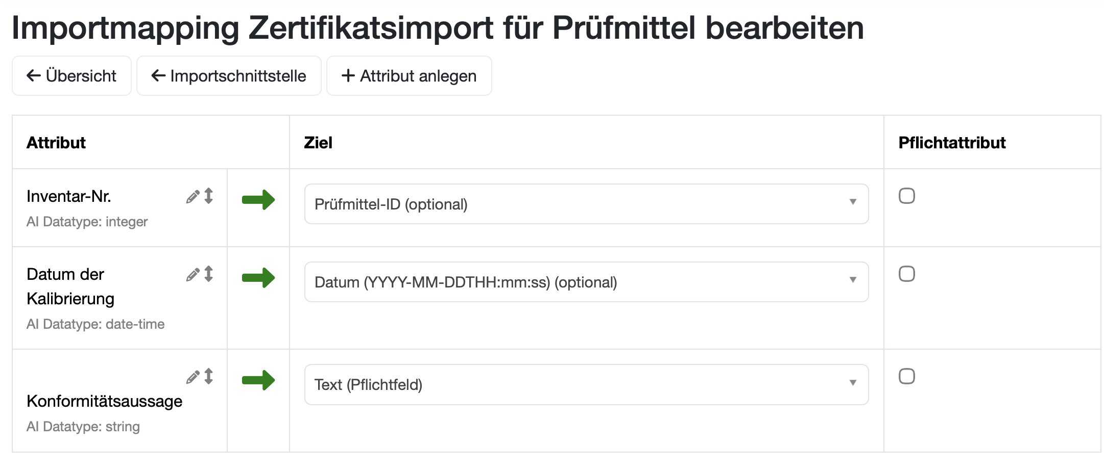 Im Importmapping ist neben der Inventar-Nr. auch das Datum der Kalibrierung und die Konformitätsaussage übernommen.