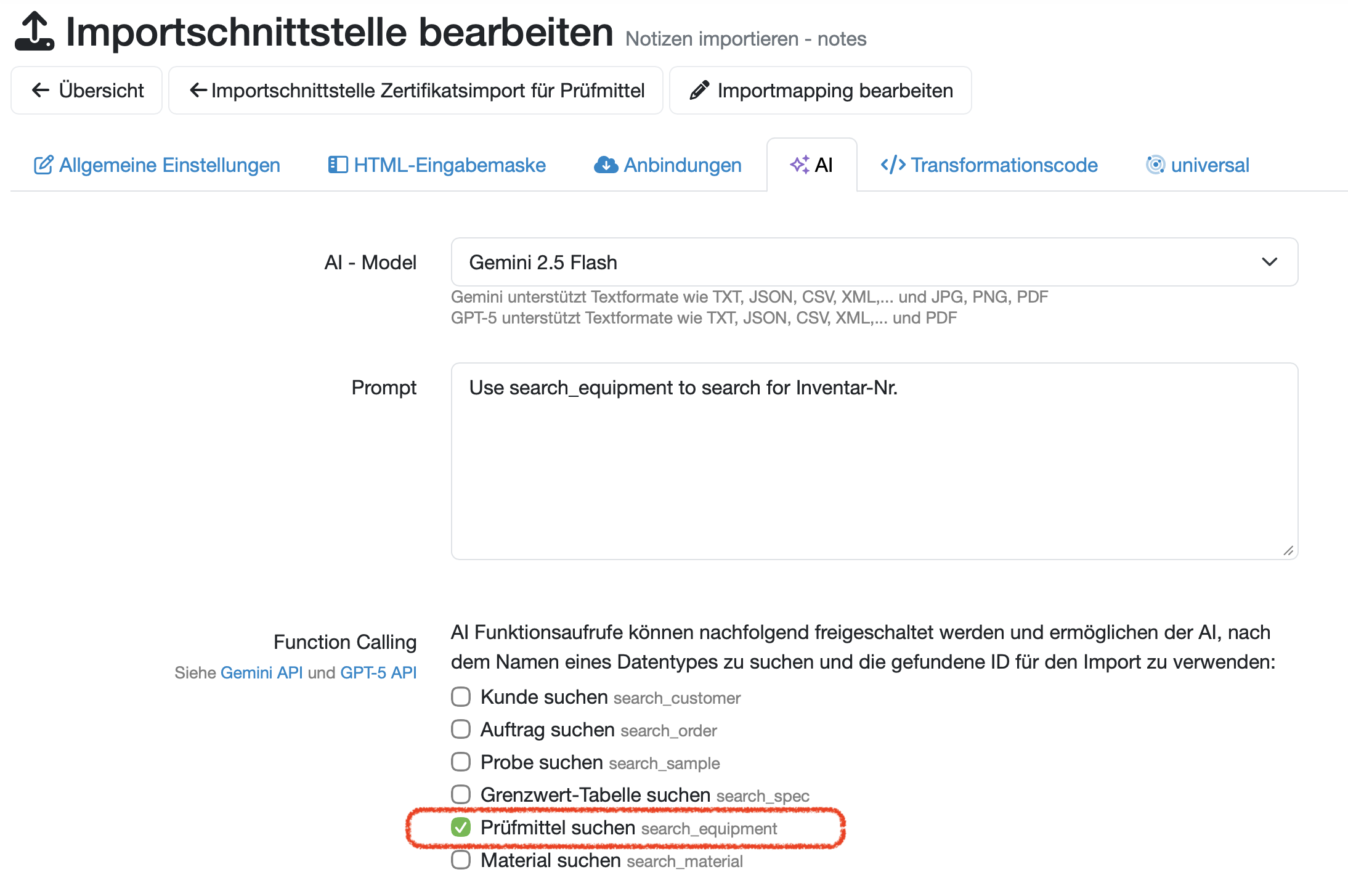 In den AI Einstellungen ist hinterlegt, dass die AI nach dem Prüfmittel suchen kann. (Die Checkbox Prüfmittel suchen - search_equipment ist angehakt.)