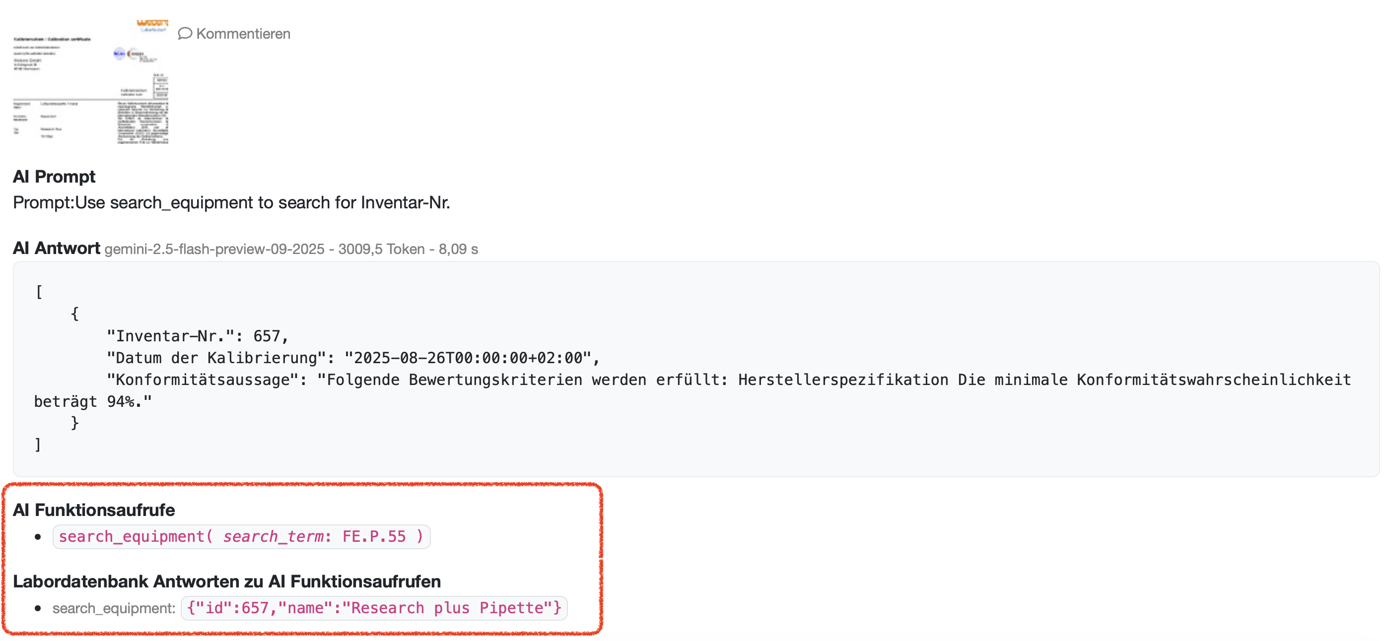 Beim Import sehen Sie detailliert die den durchgeführten AI-Funktionsaufruf und die Labordatenbank Antwort.