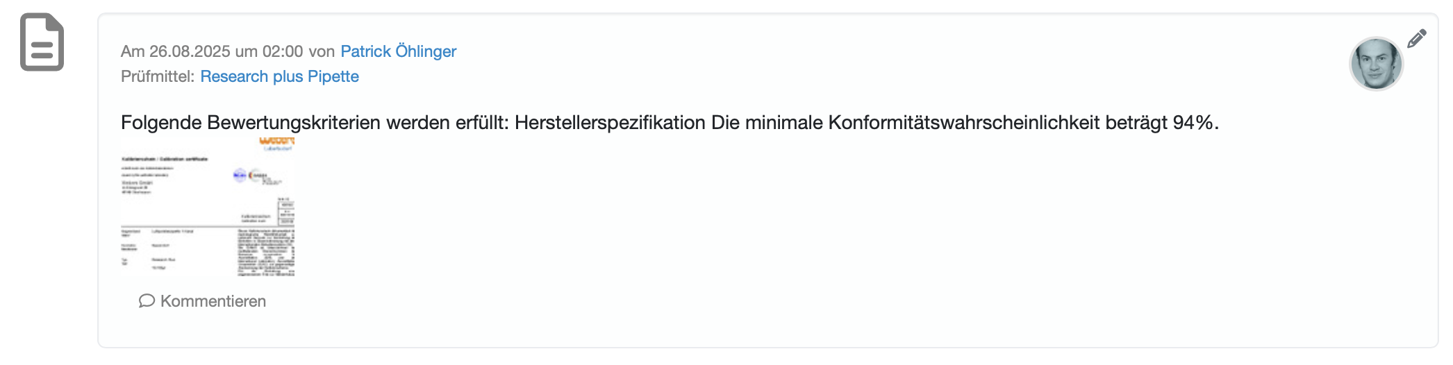 Der Testimport hat das Kalibrierzertifikat bei dem betreffenden Prüfmittel mit dem Datum der Kalibrierung hinterlegt.