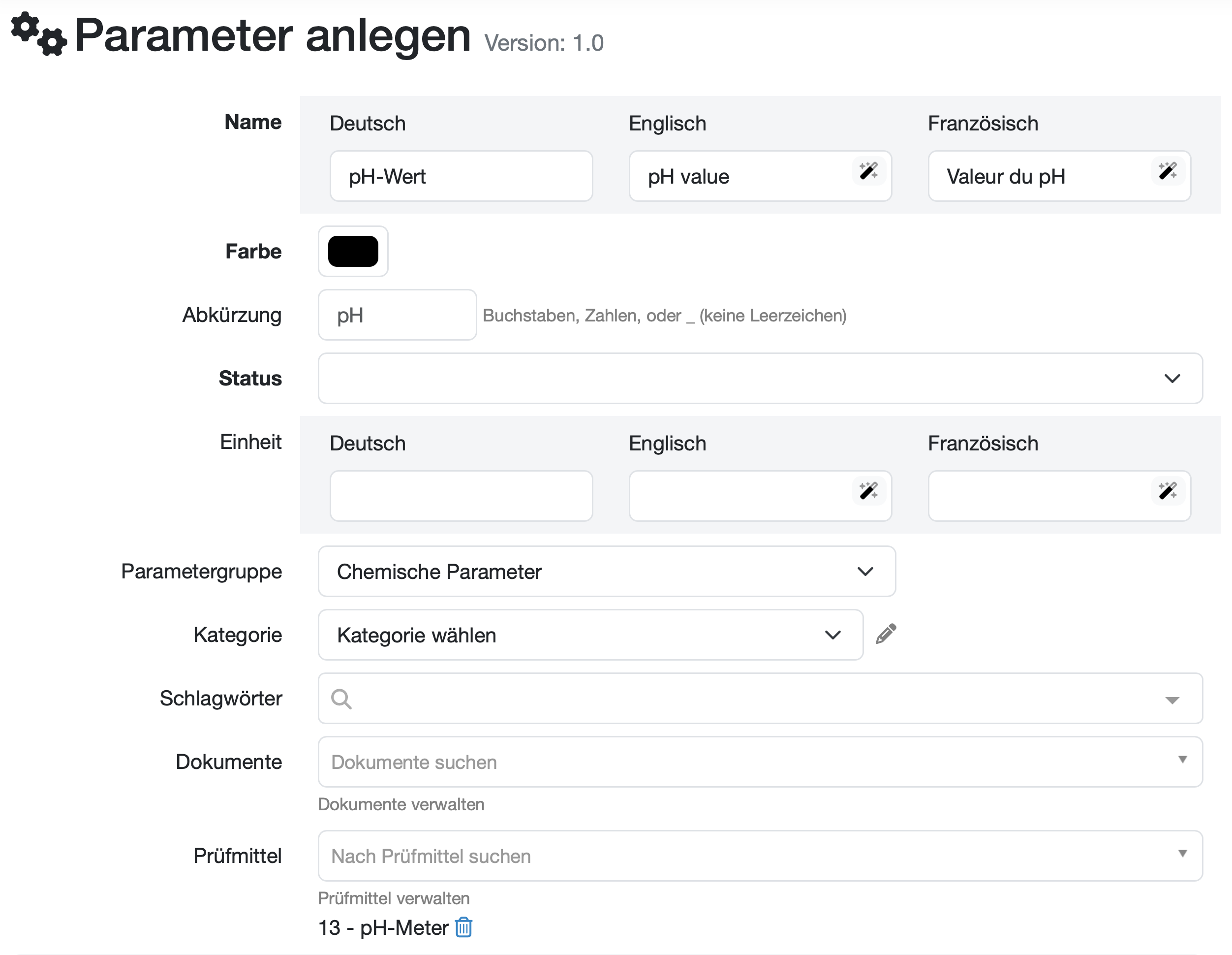 Navigationsleiste → Einstellungen → Parameter verwalten → Parameter anlegen