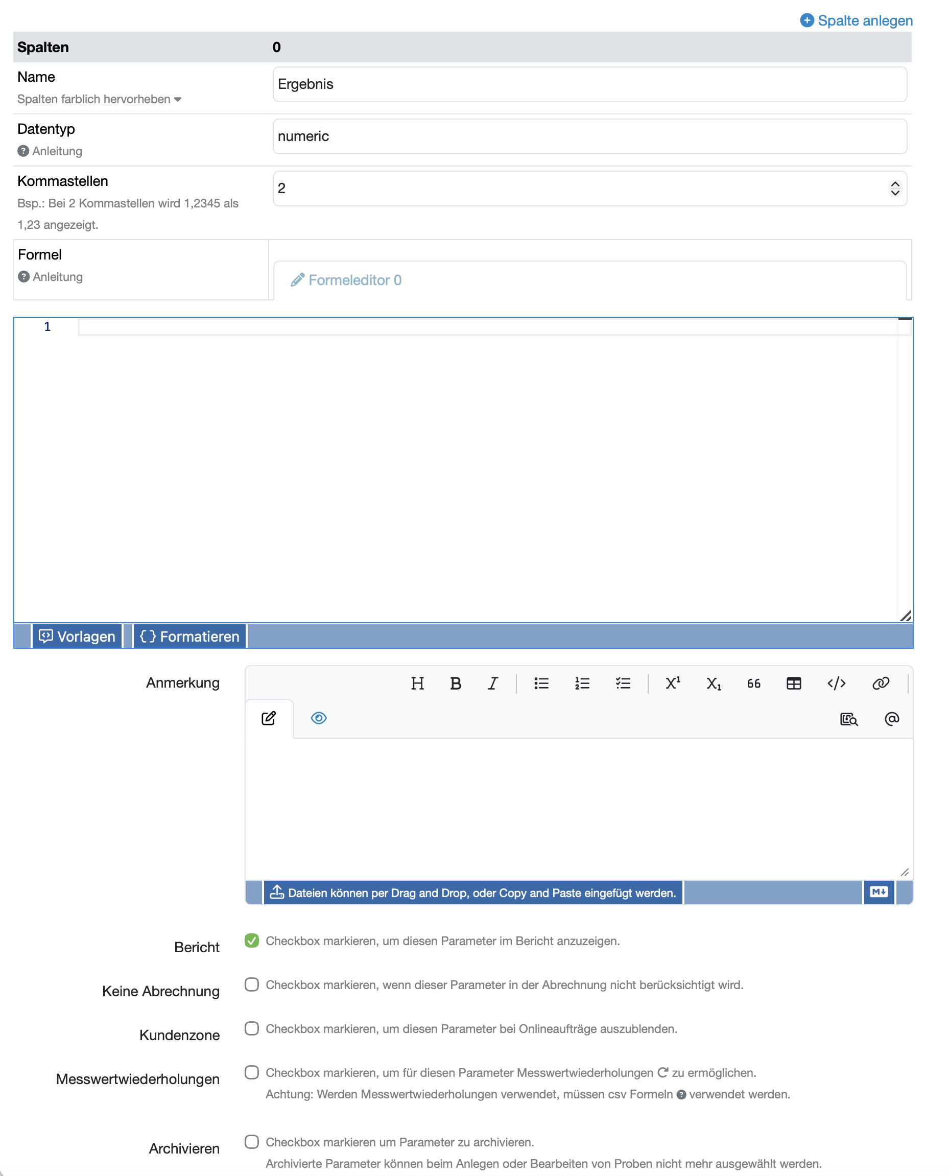 Bericht: Setzen Sie den Haken in die Checkbox, wenn der Parameter im Prüfbericht erscheinen soll. Ist diese Checkbox nicht angehakt, dann wird der Parameter nur intern erfasst und kann nicht im Bericht ausgegeben werden.