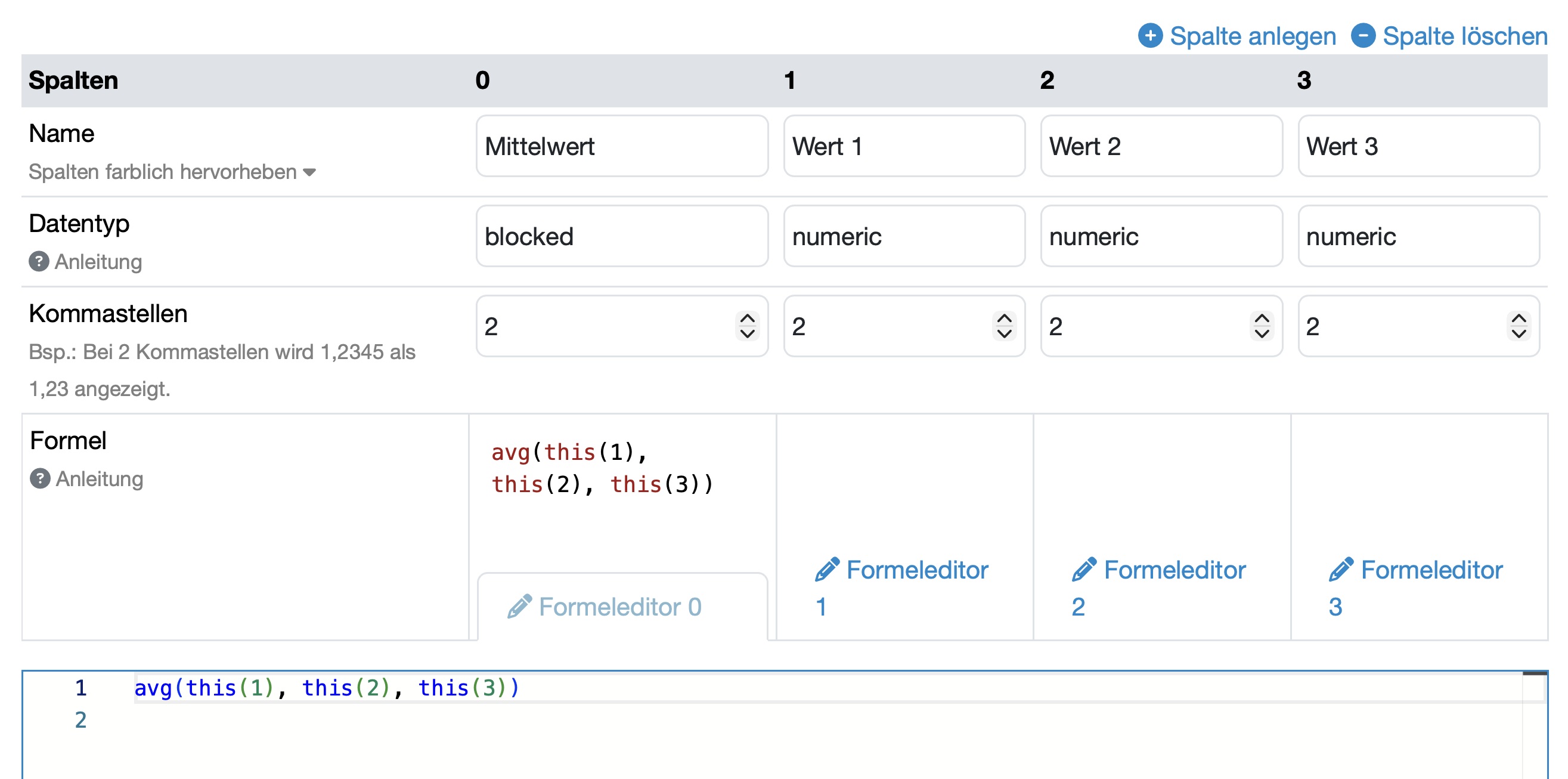 Formel: Hinterlegen Sie bei Bedarf Berechnungsformeln für automatische Berechnungen, z.B. Mittelwertberechnung oder Umrechnungen.