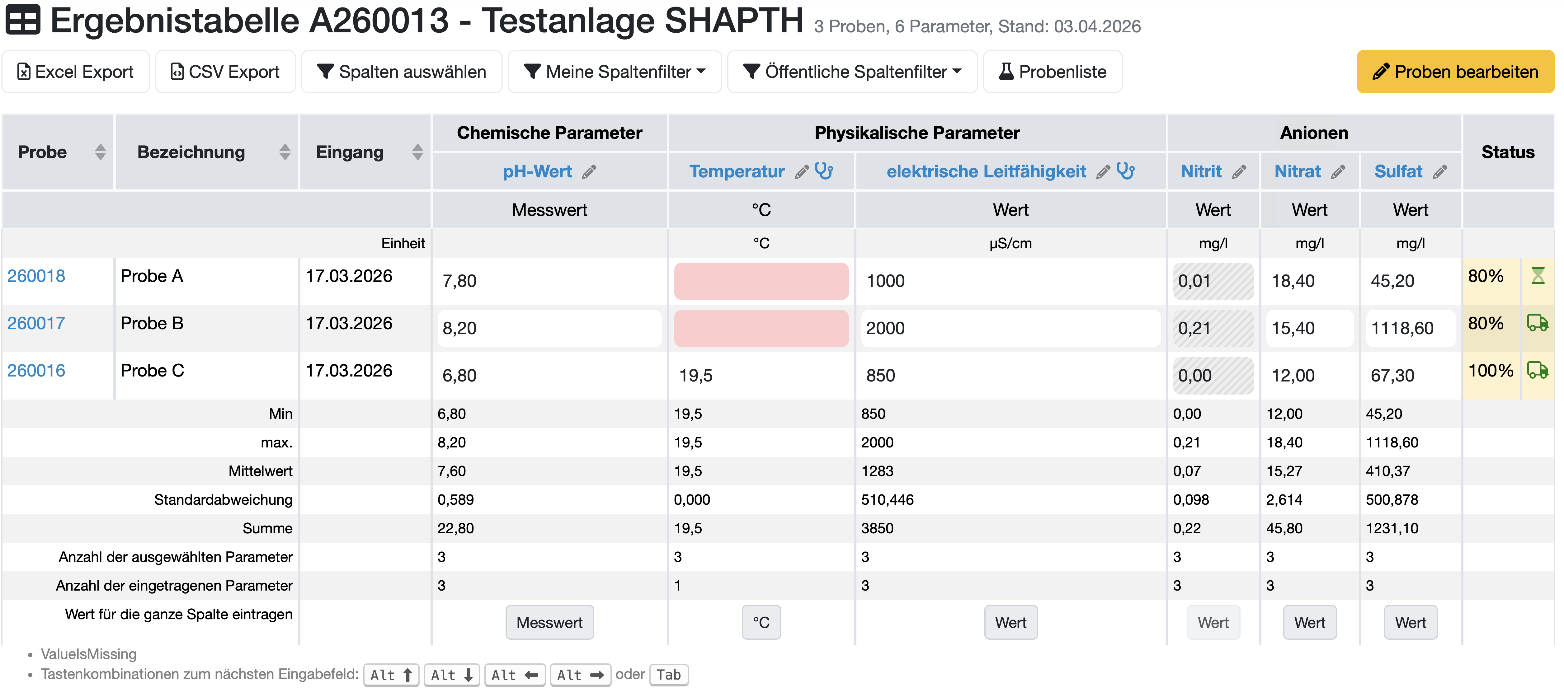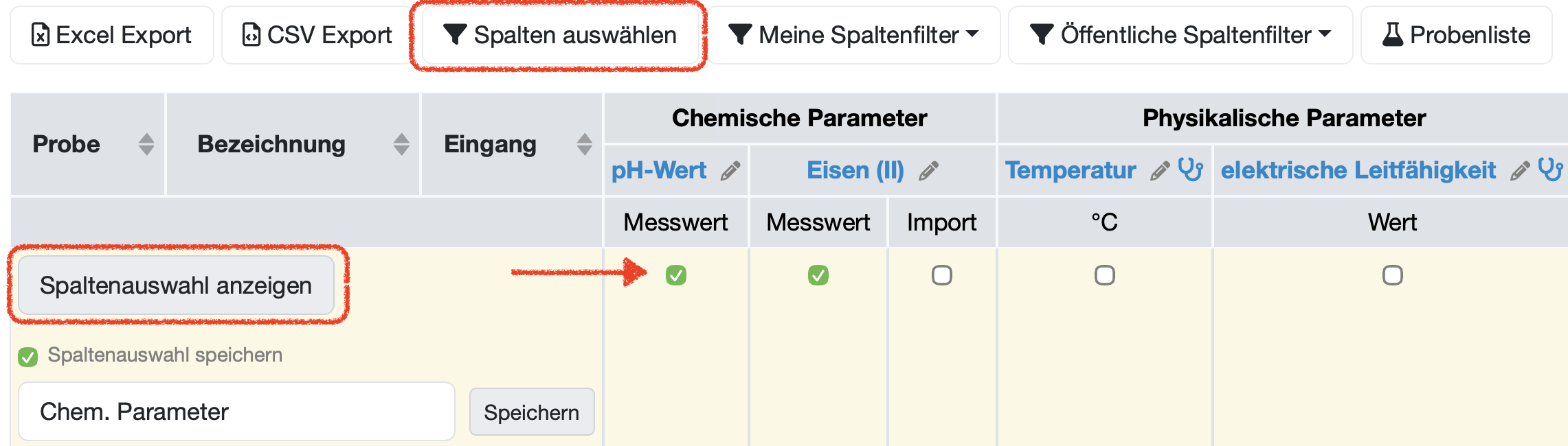 | Parametergruppen (z. B. Chemische Parameter, Physikalische Parameter, Anionen) | Proben- und konfigurationsabhängige Spaltengruppen mit den jeweiligen Einzelparametern, Einheiten und Messwerten. Ein Stiftsymbol neben dem Parameternamen ermöglicht das direkte Bearbeiten des Parametertyps (mit entsprechender Berechtigung). |