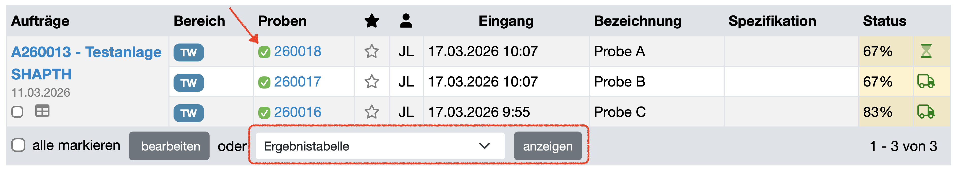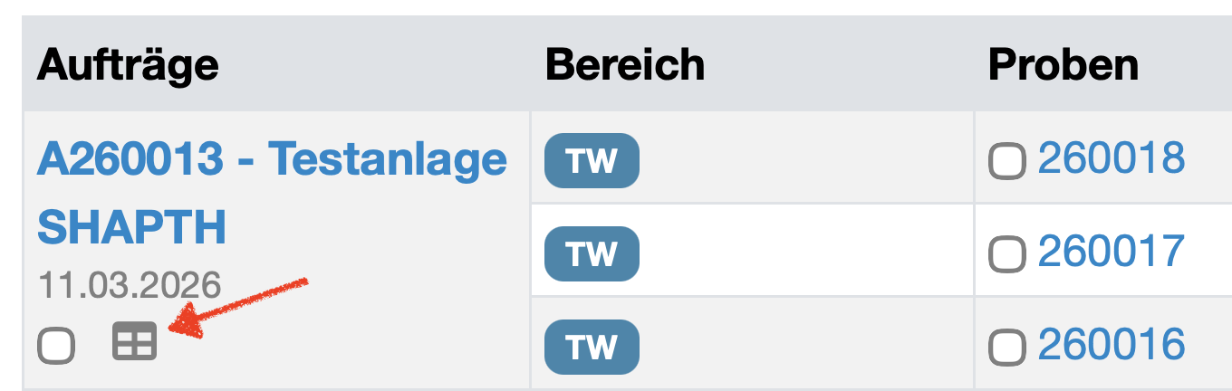 | Probe | Zeigt die Proben-Nummer als blau hinterlegten Link. Ein Klick öffnet die Detailansicht der Probe. Die Spalte ist sortierbar. |