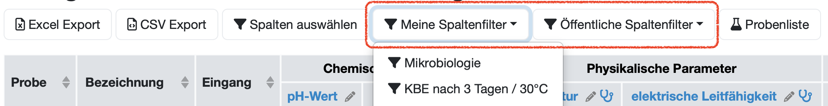 Die Proben werden zeilenweise in einer Tabelle dargestellt. Die Parameterspalten sind konfigurationsabhängig in Gruppen zusammengefasst (z. B. Chemische Parameter, Physikalische Parameter, Anionen).