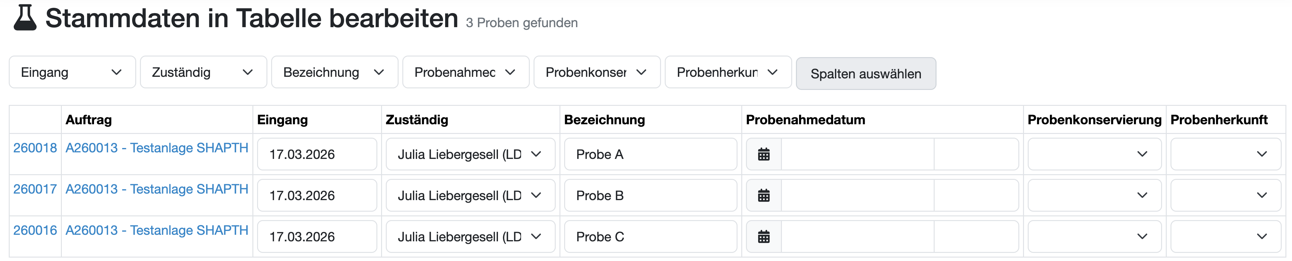 Bearbeiten Sie die Probenstammdaten mehrerer Proben in einer Tabellenansicht.