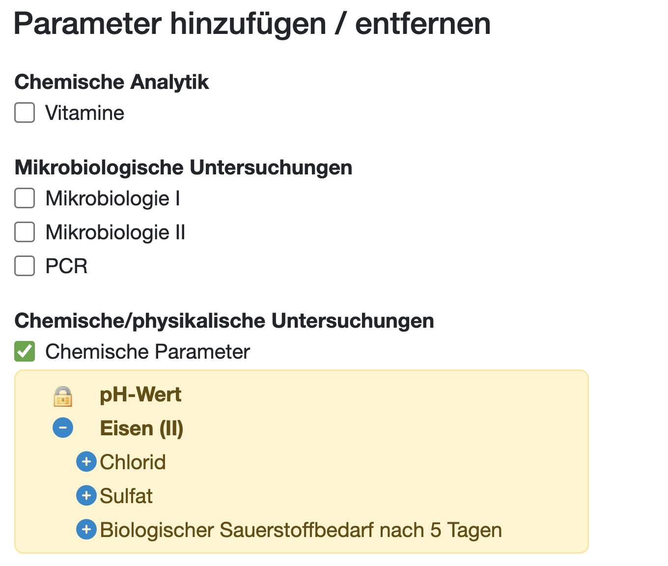 Hinweis: Parameter mit bereits eingetragenen Messwerten können nicht mehr entfernt werden. (Gekennzeichnet durch das Schlosssymbol.)