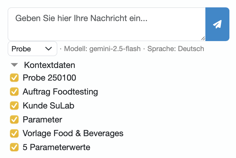 We have therefore built a customized context package into LDB LIMS for each data type. For example, the AI receives the parameters and for a sample request, the AI receives the parameters and measured values, limit value information, sample notes and associated order data as background knowledge. In the case of a question about a customer, for example, the order history, contact persons and open processes are provided in context. This dynamic context is compiled fully automatically in the background while you formulate your question. The result: the AI "knows" what the question is about and you receive high-quality, precise answers instead of generic outputs. This elaborate context preparation clearly sets our AI integration apart from simple AI demos - the difference between an ordinary chatbot and the AI Explorer lies primarily in the quality of the context provided.