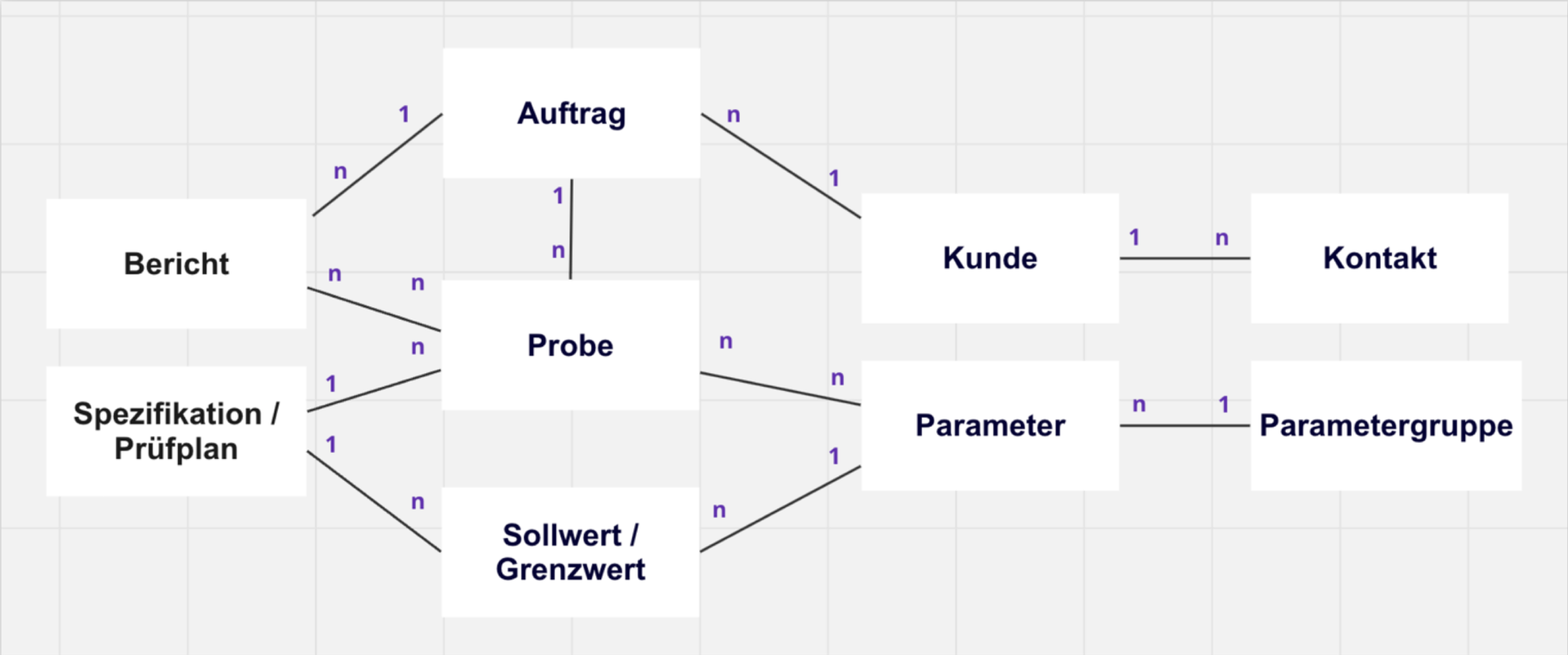 n contacts and n orders (n = 0, 1 or more).one customer, has n samples and n reports.one order, has one specification / test plan and n parameters.one order and has n samples.n target values, each applying to one parameter.n samples, has n target values and belongs to one parameter group.n parameters.Figure: Data structure LDB