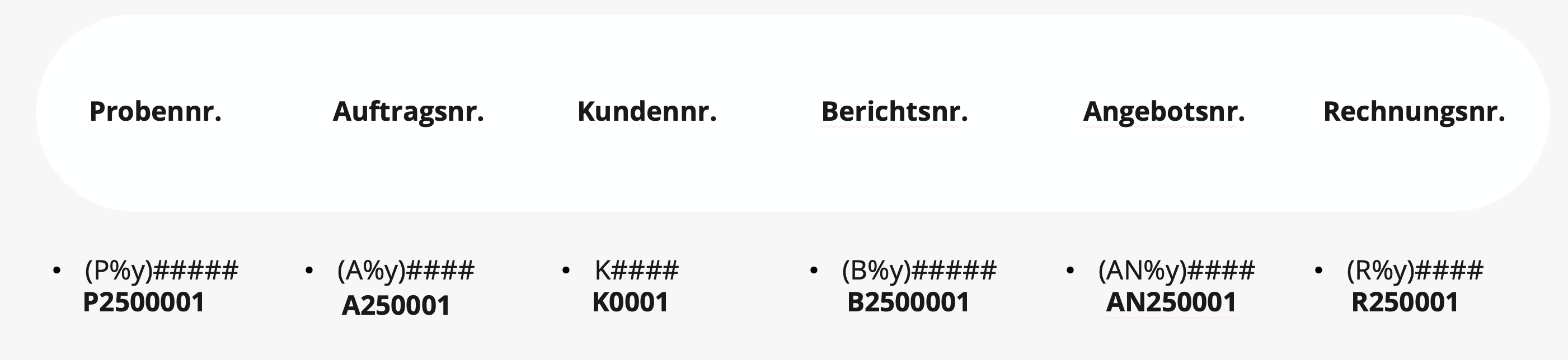 Number ranges can be configured individually (e.g. continuing existing numbering systems, if not too complex, or starting from a specific number). Let us know your desired format.