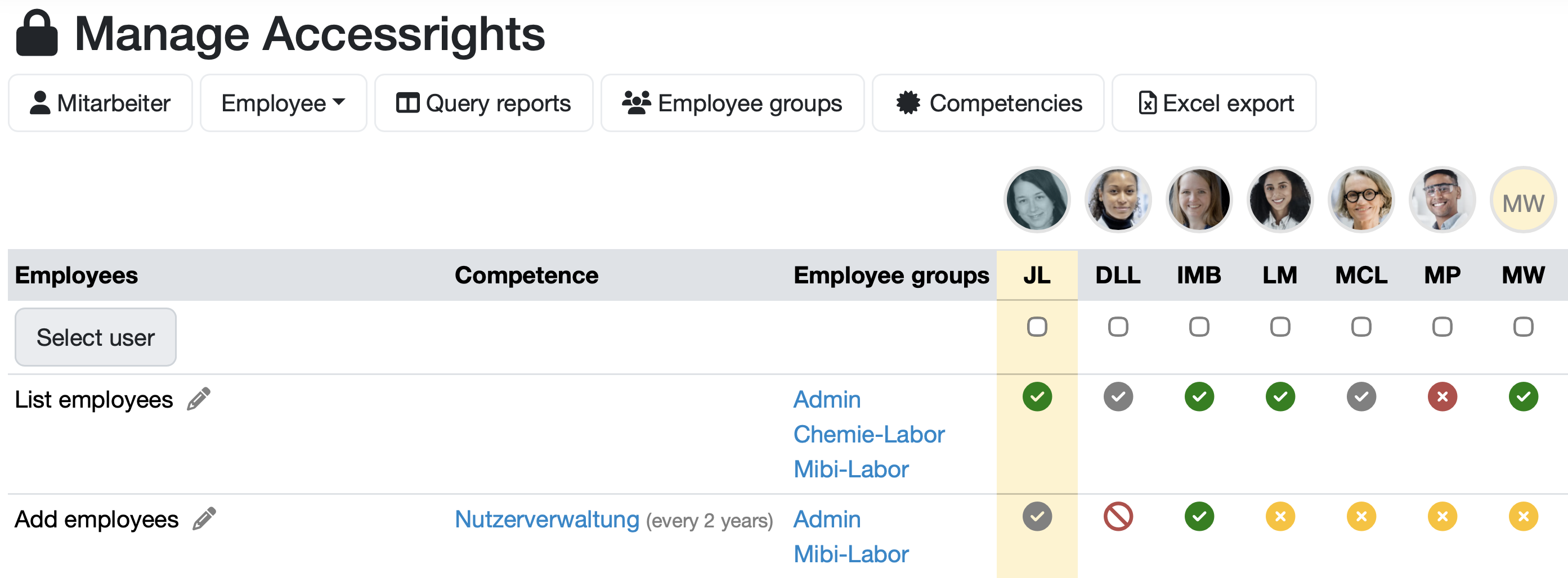 Structure employees, groups and roles sensibly, assign access rights (who is allowed to see, edit, delete what) and link competencies to access rights to build ISO 17025-compliant rights management.