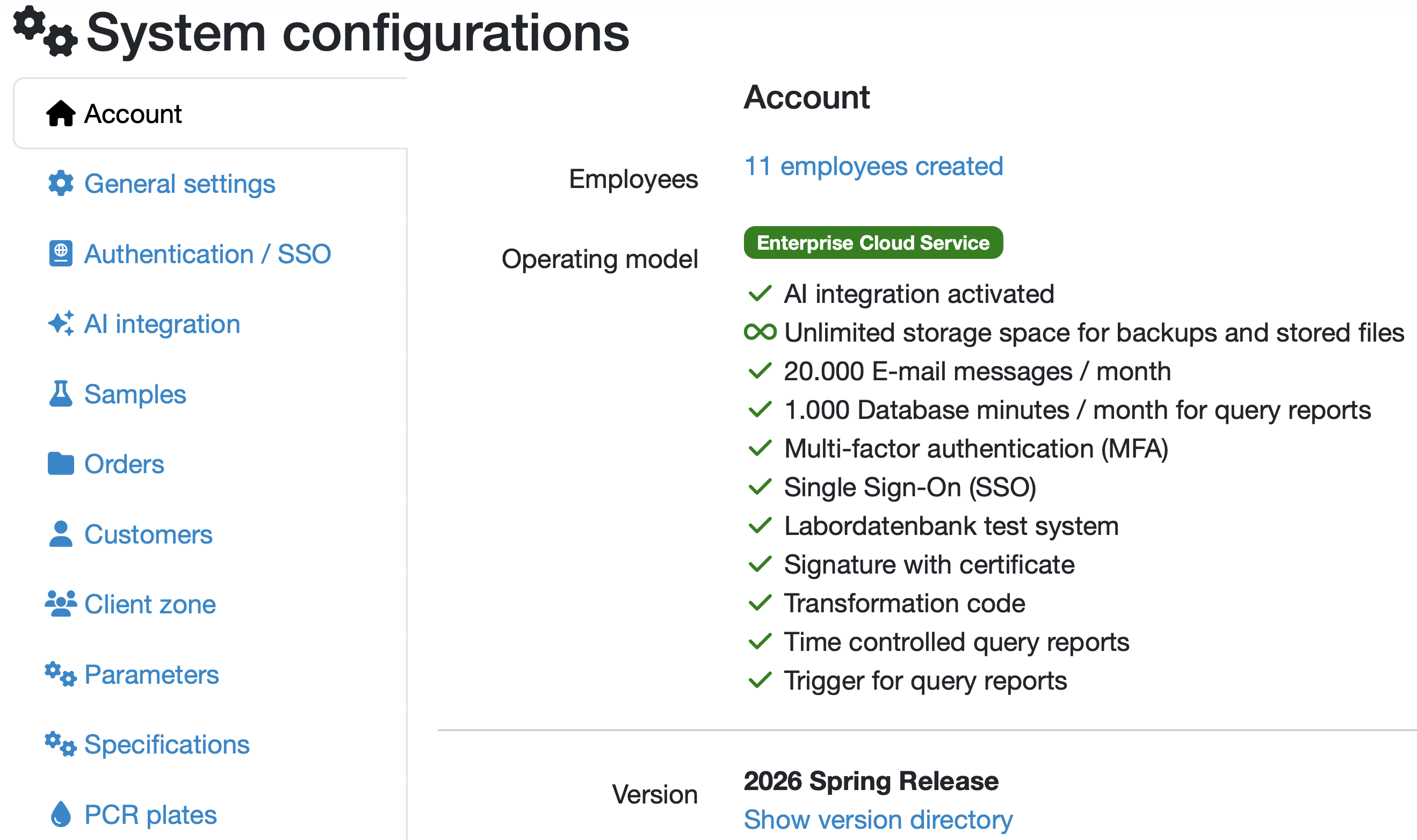 In the employee groups, you can define under Access to area which sample areas the group can see. Important: Once you use areas, all samples must be assigned to an area, otherwise unassigned samples will not be visible to anyone. Employees can be in multiple groups and thus gain access to multiple areas. This is also suitable for separating multiple laboratory locations within one system.