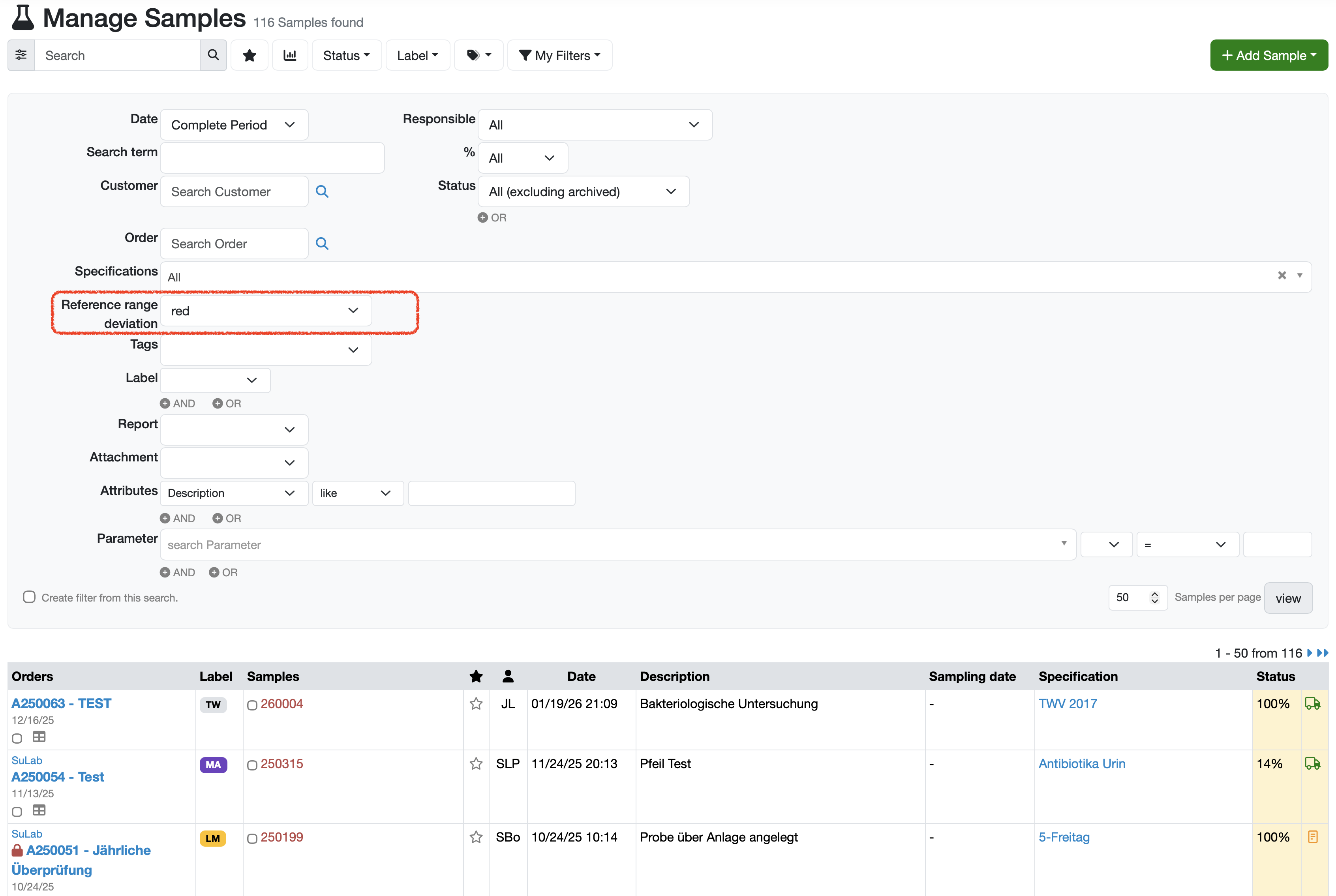 With the Reference range deviation filter, you can search specifically for samples that deviate from the defined reference ranges.